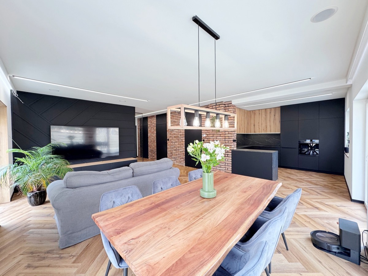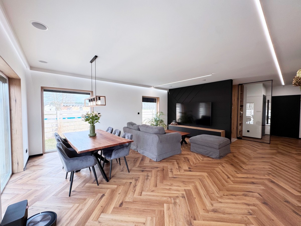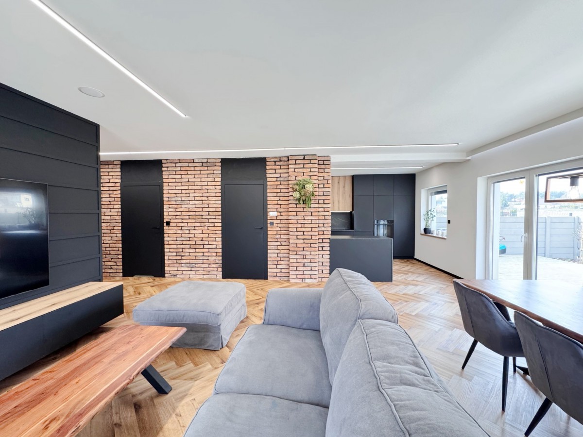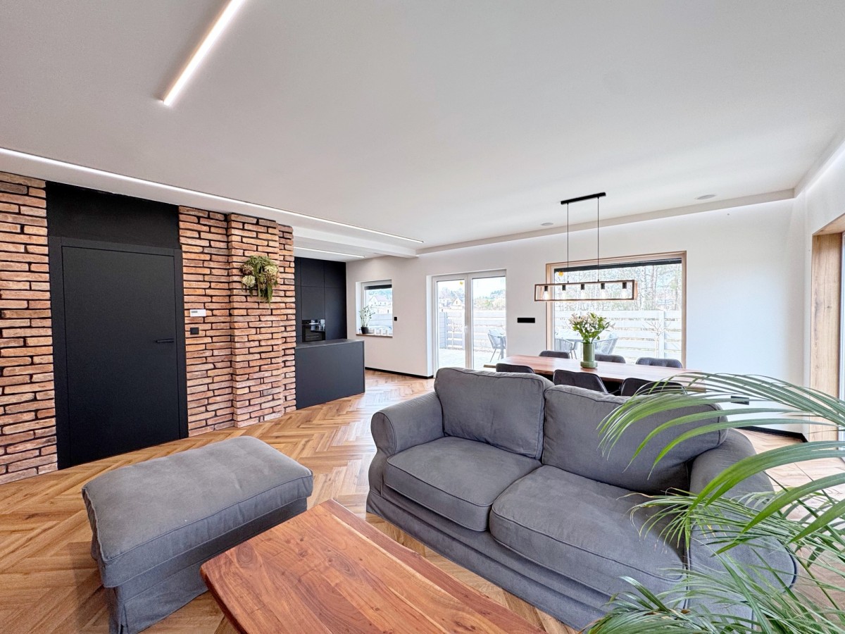Na podłogach położono stylową jodełkę winylową, która świetnie komponuje się z czerwoną cegłą na ścianach. Przestronny salon połączony jest z aneksem kuchennym, gdzie duże przeszklenia otwierają wnętrze na ogród i zapewniają doskonałe doświetlenie.
