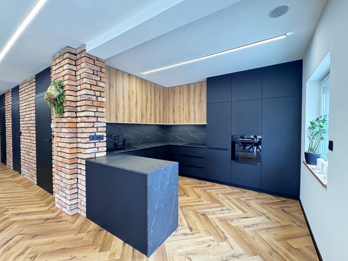 Kuchnia zaprojektowana została na wymiar przez stolarza oraz wyposażona w sprzęt AGD (lodówka z kostkarką, zmywarka, płyta indukcyjna, piekarnik, okap oraz ekspres do kawy).