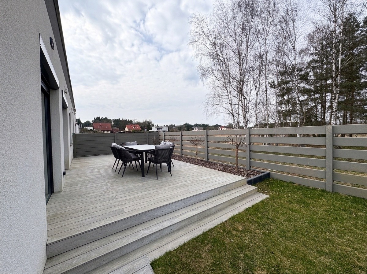 Bezpośrednio z salonu wyjdziemy na taras z wysokiej jakości desek, na którym znajdują się stylowe meble ogrodowe. Ogród posiada system automatycznego nawadniania zasilany z własnej studni głębinowej.