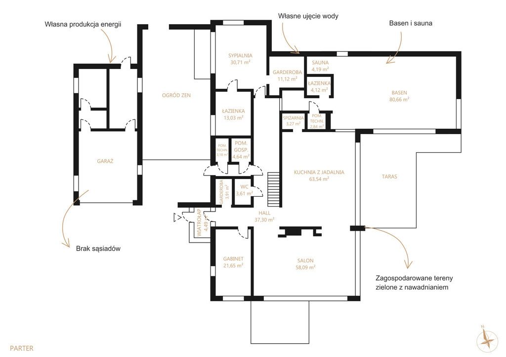 Parter (ok. 279 m² 102 m² część basenowa):- reprezentacyjna strefa dzienna z salonem, jadalnią i kuchnią