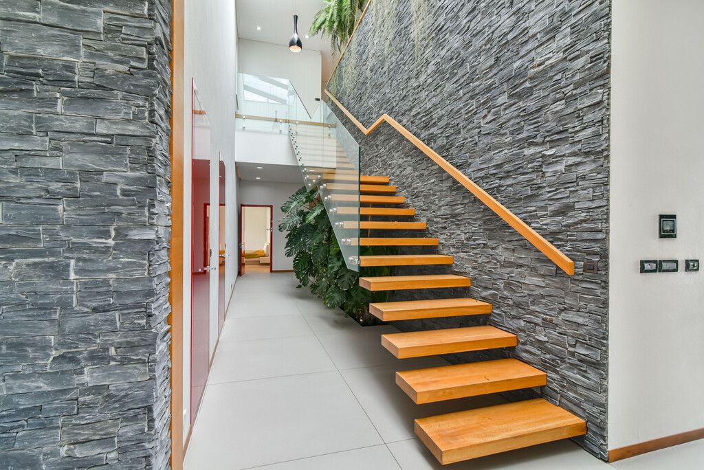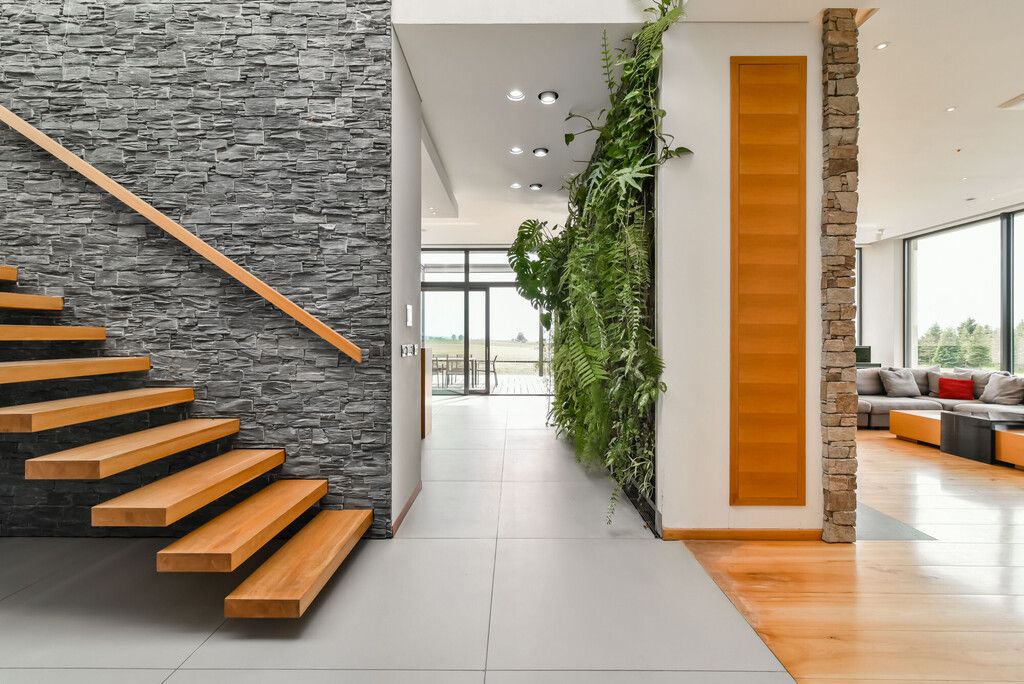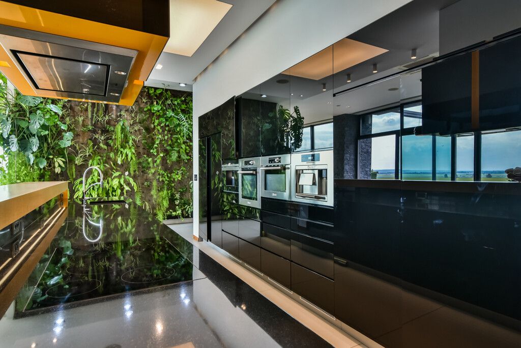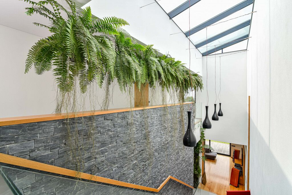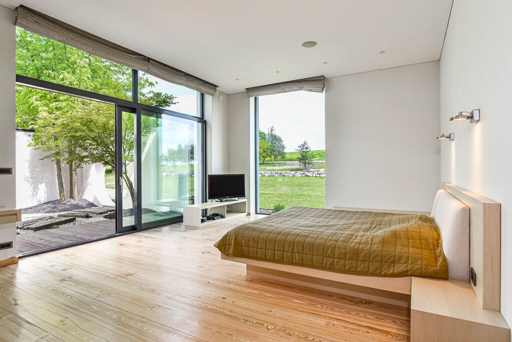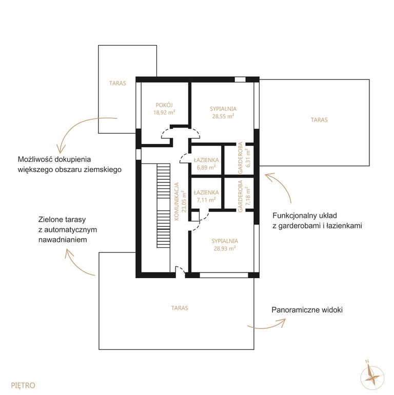 Piętro (ok. 130 m²):- 3 sypialnie z panoramicznymi przeszkleniami i wyjściem na tarasy porośnięte zielenią