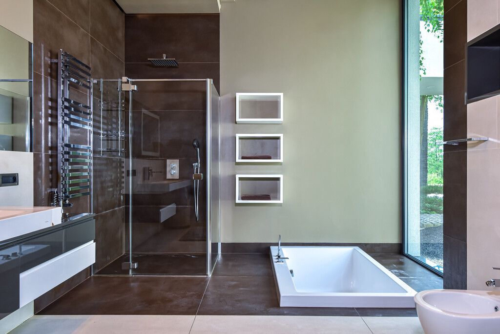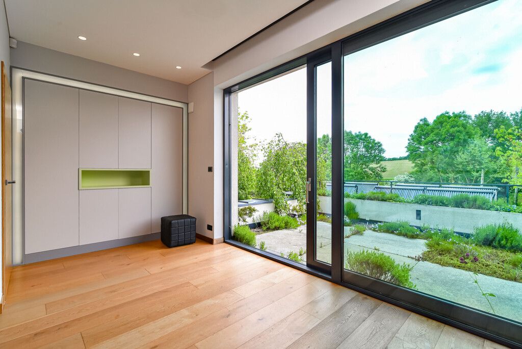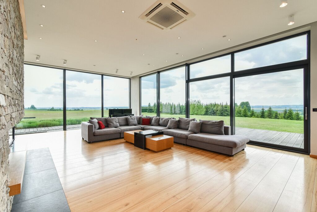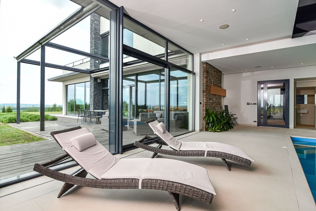 - Okna: duże, aluminiowe, z roletami i ekranami przeciwsłonecznymi
