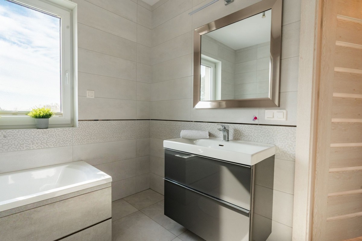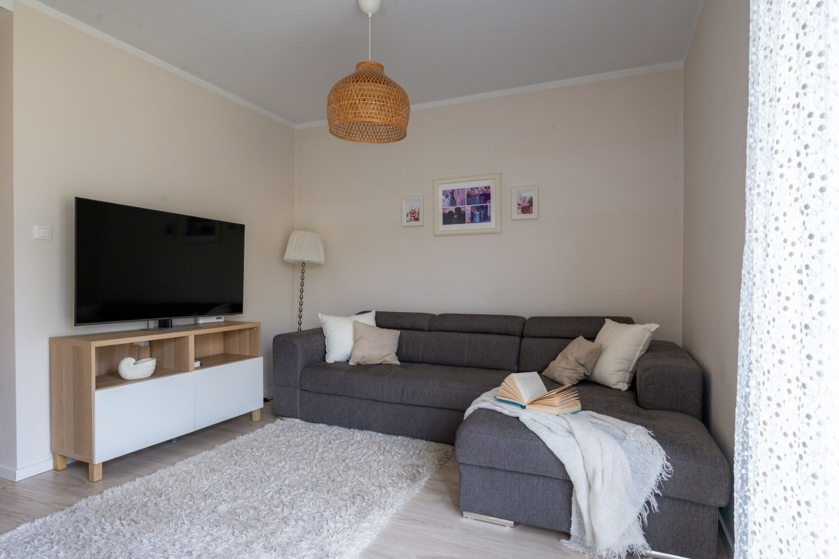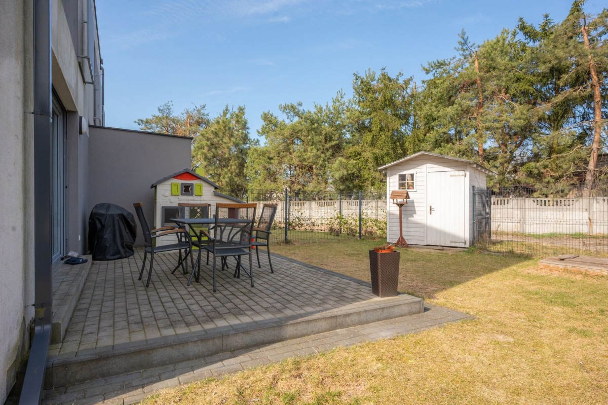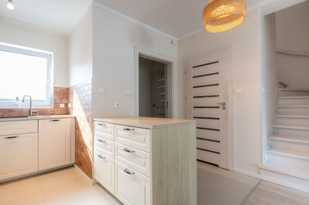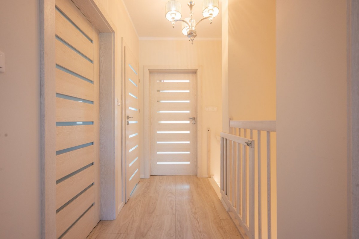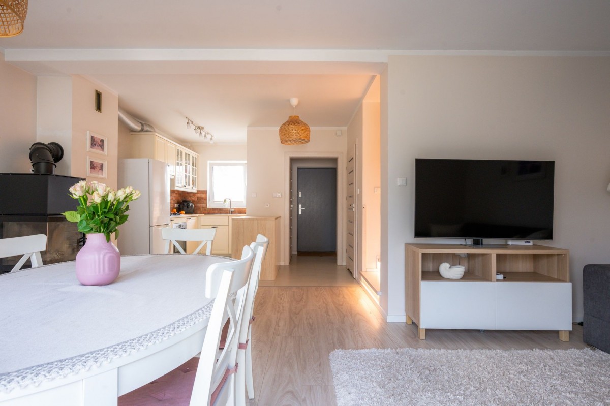 Spokojna okolica domów jednorodzinnych. Osiedle jest w pełni uzbrojone w kanalizację, co nie jest standardem w okolicy. Gmina Kórnik jest dobrze rozwinięta - szkoły, przedszkola, sklepy i usługi są na miejscu. W pobliżu lasy i Jezioro Kórnickie, popularne miejsce spacerów i rekreacji. UKŁAD DOMU: Dom ma prosty i funkcjonalny układ. Parter zaczyna się od wiatrołapu z miejscem na szafę oraz dodatkowego pomieszczenia gospodarczego, które można wykorzystać jako pralnię. Z wiatrołapu przechodzi się do części dziennej domu, gdzie centralnym punktem jest salon z kominkiem i wyjściem do ogrodu. Obok znajduje się otwarta kuchnia z miejscem na stół, toaleta oraz komunikacja prowadząca na piętro - betonowymi schodami z drewnianą obudową. Na piętrze znajduje się prywatna strefa domowników - sypialnia główna, dwa dodatkowe pokoje, które mogą służyć jako pokoje dziecięce, gabinet lub pokój gościnny, oraz duża łazienka. Dodatkowo strych zapewnia wygodne miejsce do przechowywania lub sezonowego użytkowania. INFORMACJE TECHNICZNE: rok budowy: 2020 konstrukcja: pustak ceramiczny 24 cm + ocieplenie styropian gr 15 cm + ocieplenie dachu wełną ogrzewanie: gazowe (piec dwufunkcyjny VIESSMANN) + kominek w salonie media: woda, prąd, gaz, kanalizacja (co nie jest standardem na osiedlu) standard: bardzo dobry
