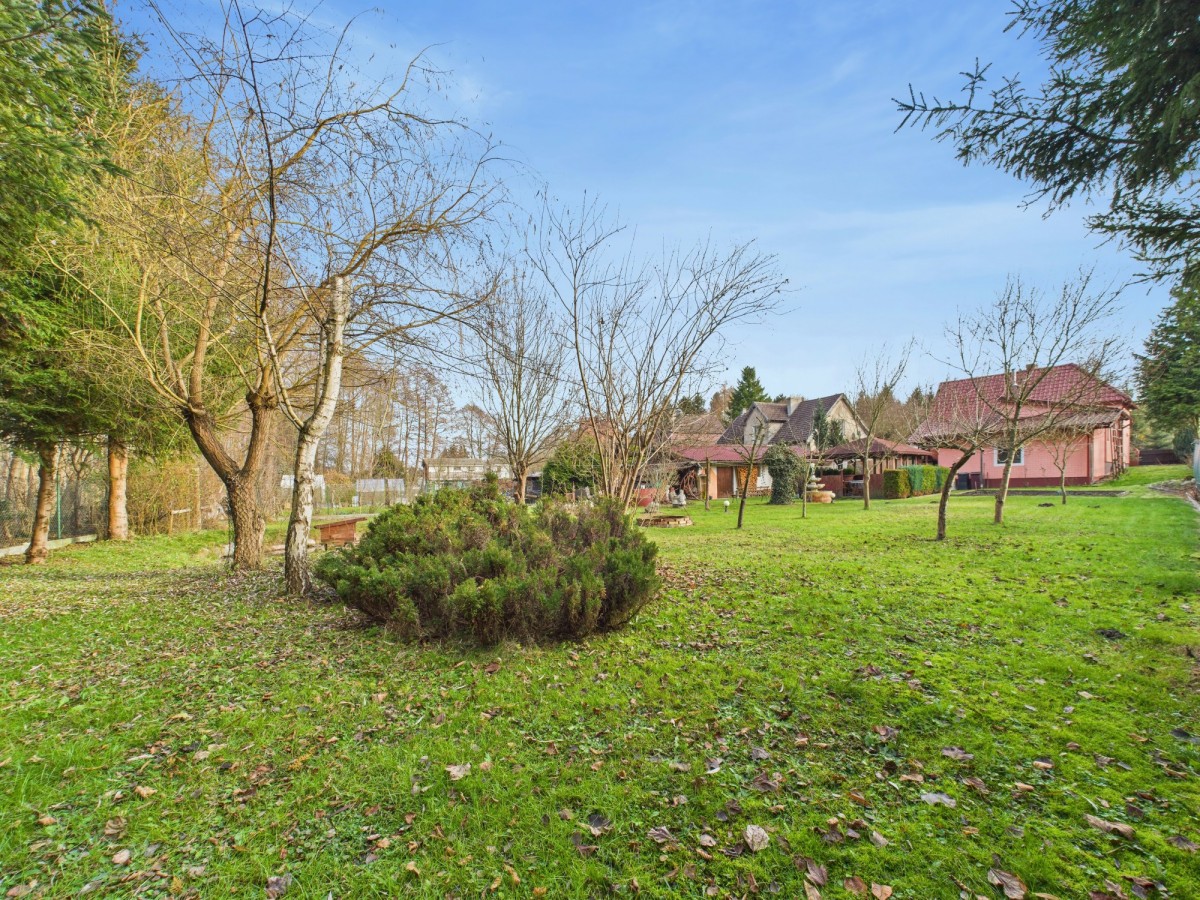 Zadbana działka z nasadzeniami o powierzchni 1300 m² położona tuż przy lesie, zapewnia bliskość natury oraz idealne warunki do relaksu. Za drewnianym ogrodzeniem i bramą wjazdową znajdziesz piękną przestrzeń, na której są również dodatkowe pomieszczenia gospodarcze, jedno z nich pełni funkcję garażu. Dom posiada monitoring, dzięki któremu dodatkowo będziesz czuł się bezpiecznie.