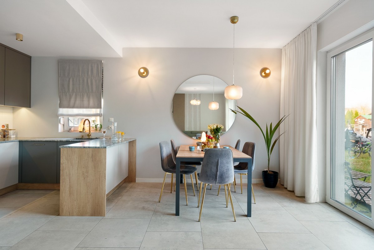 Starannie zaprojektowane oświetlenie wielostrefowe (kuchnia, jadalnia, salon).