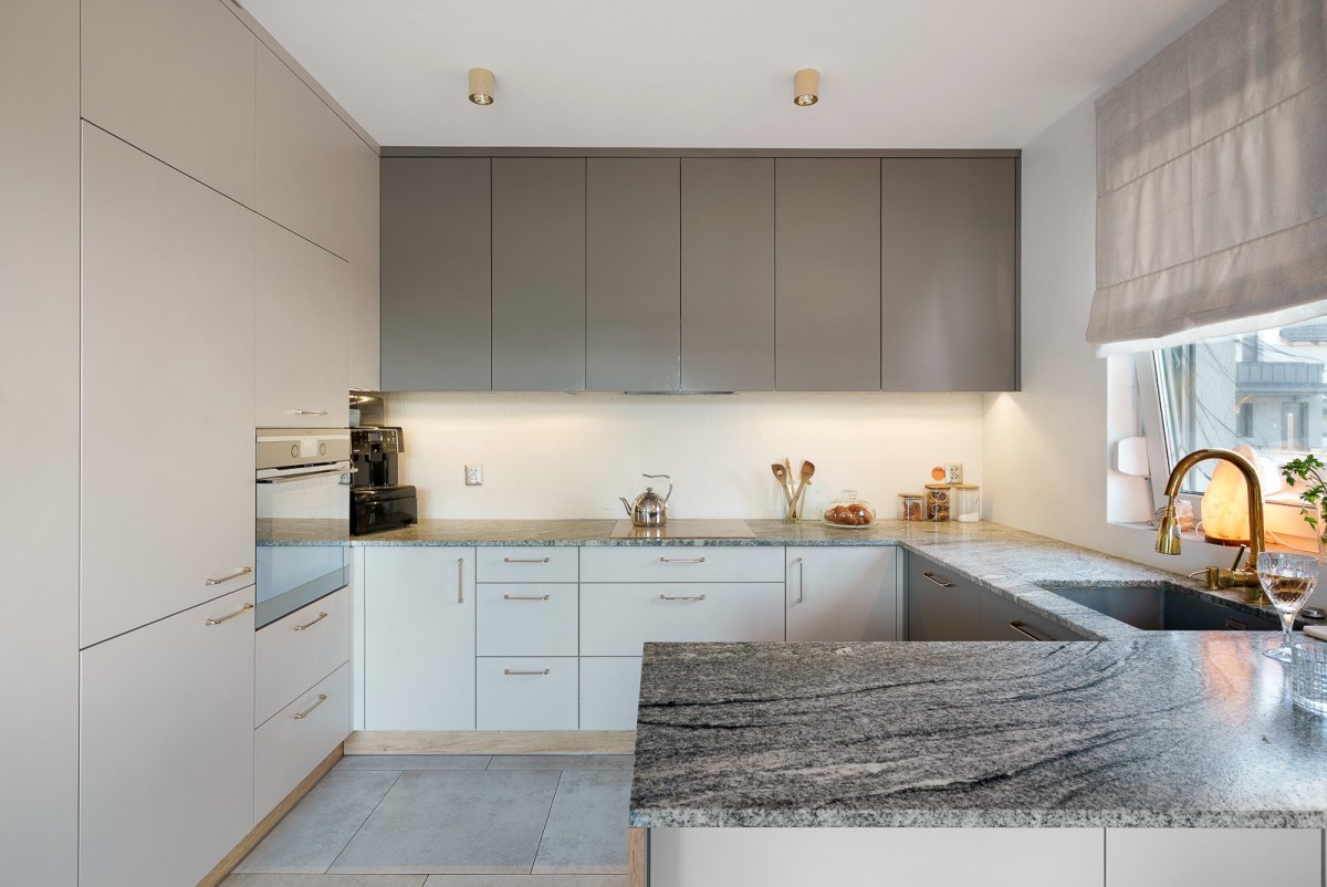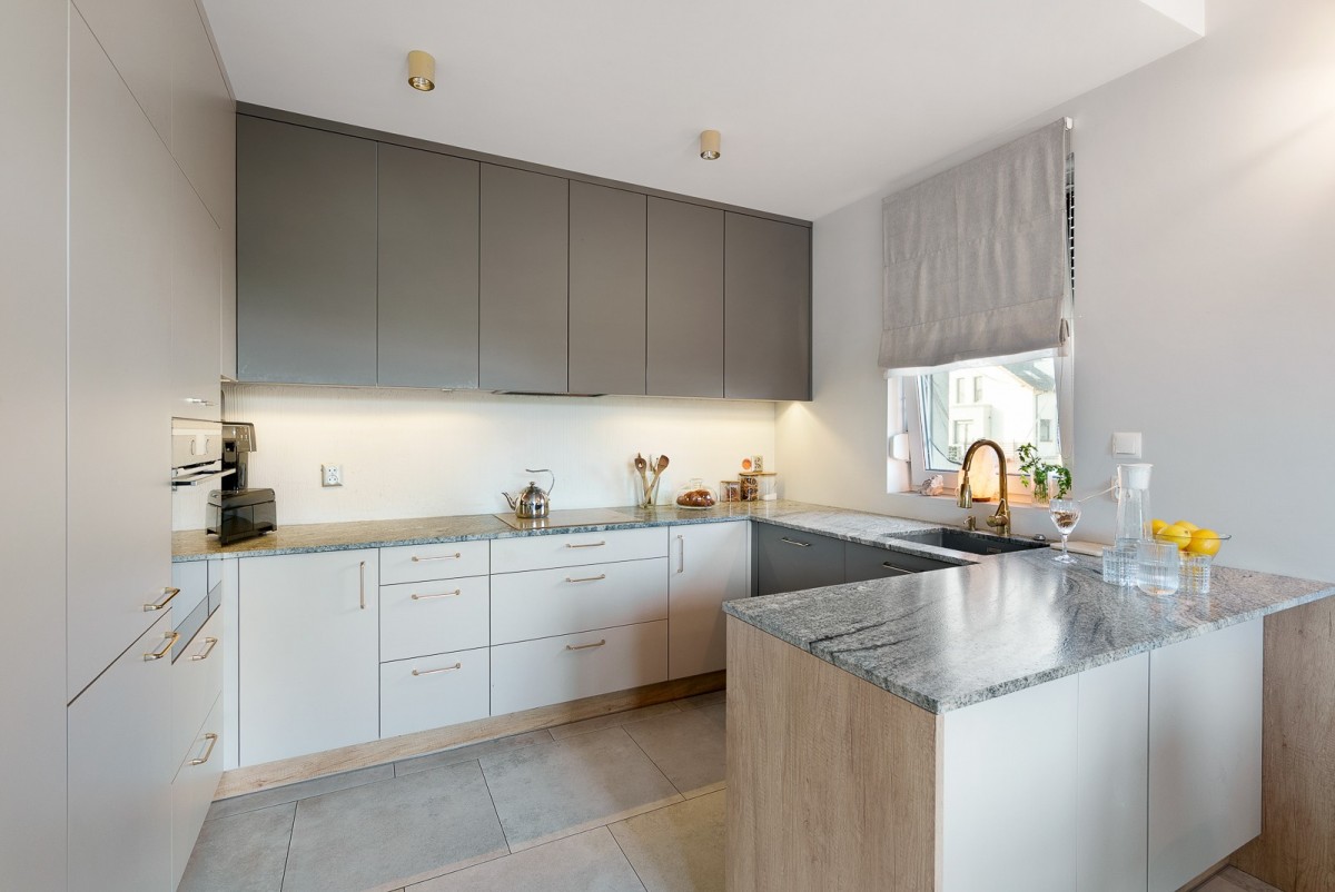 Zabudowa na wymiar z ukrytymi sprzętami (lodówka, zmywarka).