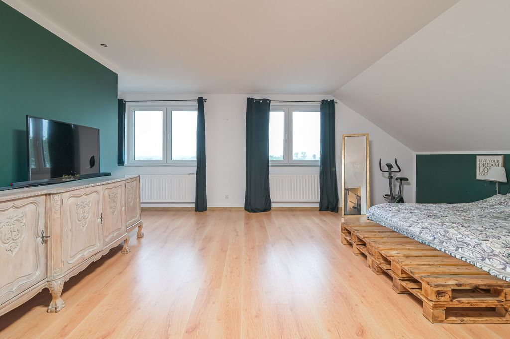 - Sypialnia główna (33,43m) – niezwykle przestronna, z potencjałem podzielenia na dwie mniejsze sypialnie lub stworzenia luksusowego apartamentu z własną łazienką i garderobą.