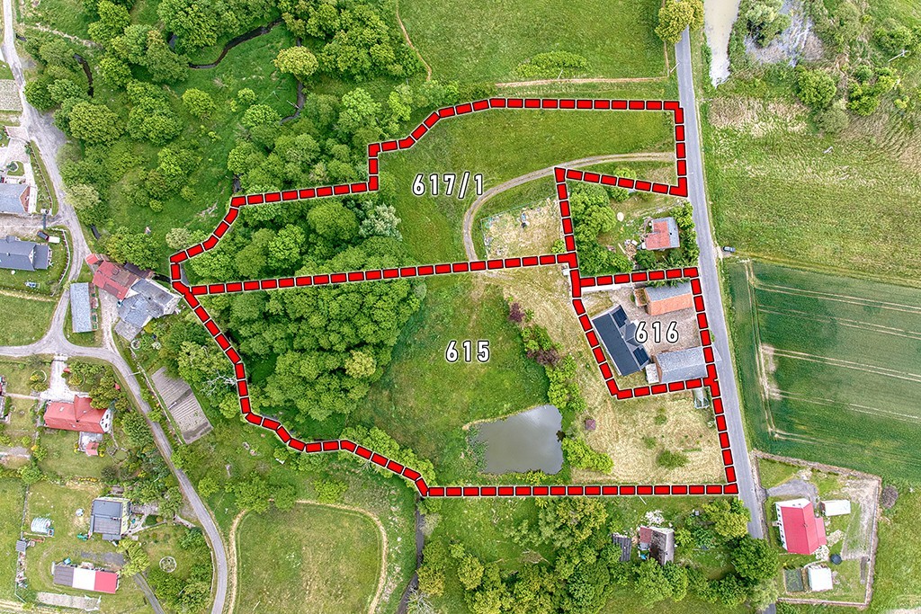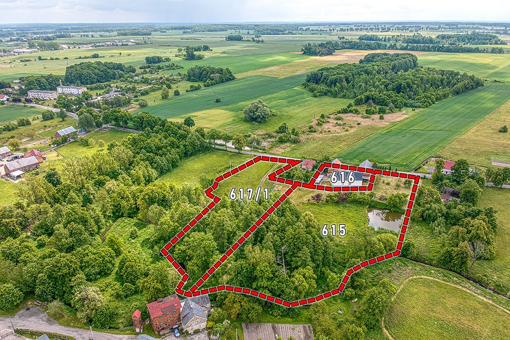 Nieruchomość położona jest na trzech działkach o nr 616 + nr 615 + 617/1, o łącznej powierzchni aż 17 500 m² i jest uzbrojona w media: woda, kanalizacja, energia elektryczna oraz posiada instalację fotowoltaiczną. Droga dojazdową asfaltowa.