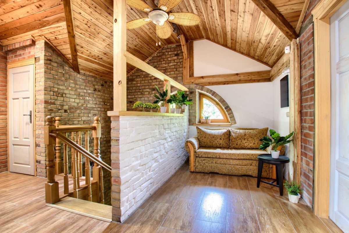 Został zbudowany metodą tradycyjną z cegły formowanej ręcznie. Każdy etap inwestycji był przemyślany o czym świadczy efekt końcowy. Wnętrza zostały wykończone drewnem, sufity i ściany modrzewiem, schody są dębowe, a drzwi sosnowe. Okna również są drewniane. Na podłodze trawertyn, cegła i deska.