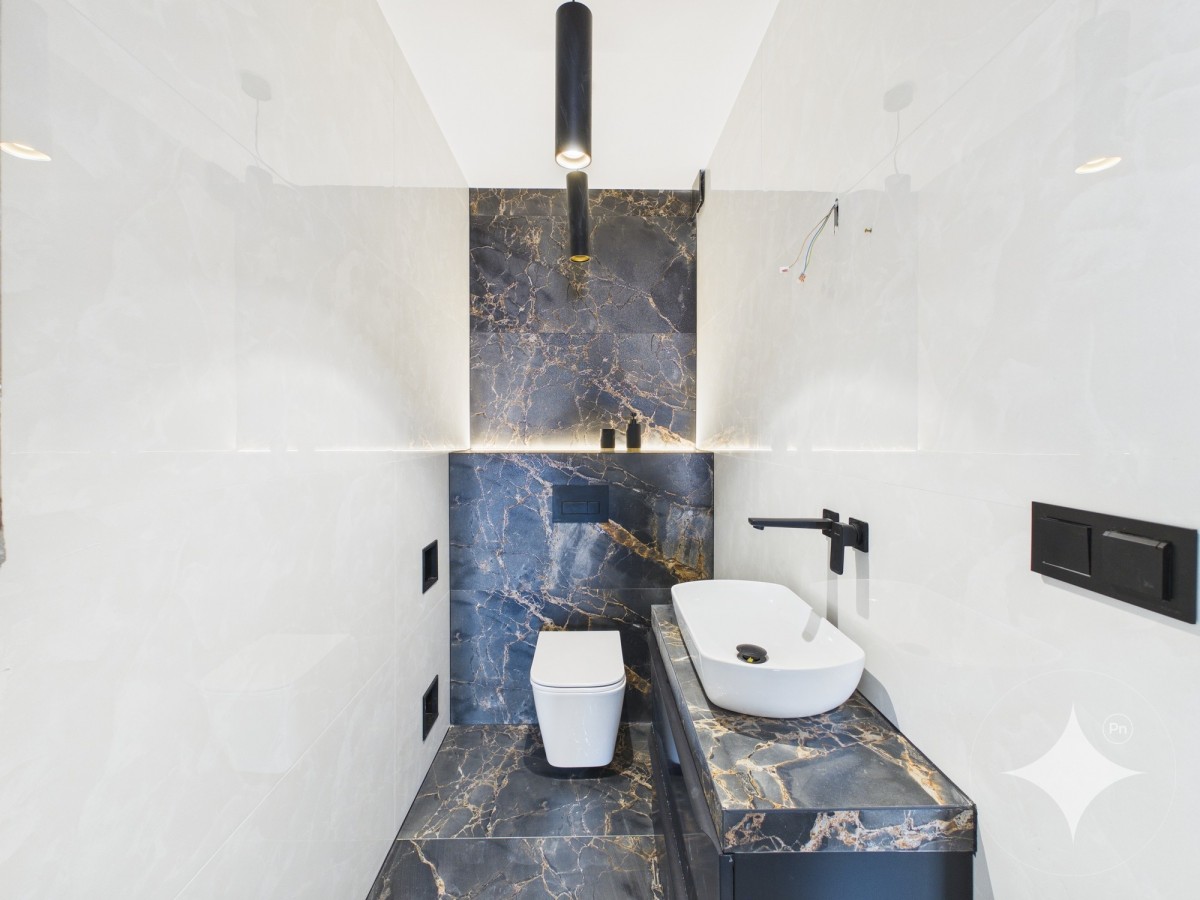 Na parterze zostały już wykonane ważne prace wykończeniowe - położone płytki w salonie, kuchni oraz korytarzu, a także wykończona łazienka i WC.