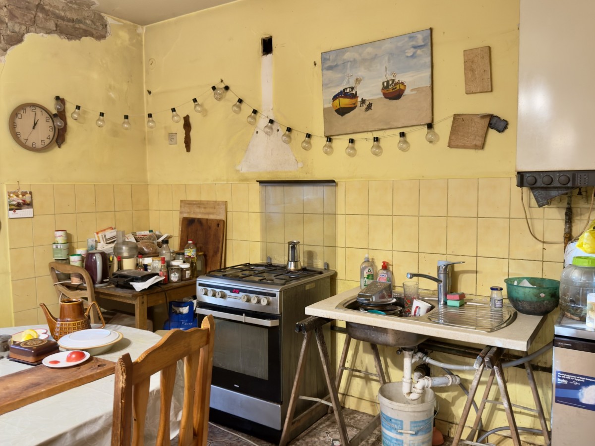 -na parterze mamy korytarz z zejściem do piwnicy, aneks kuchenny z pokojem, łazienka i drugi pokój
