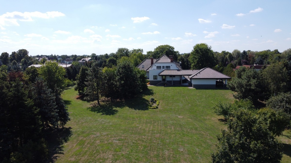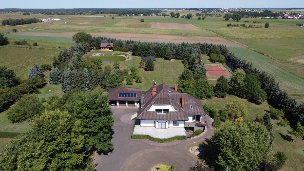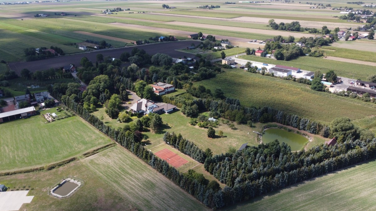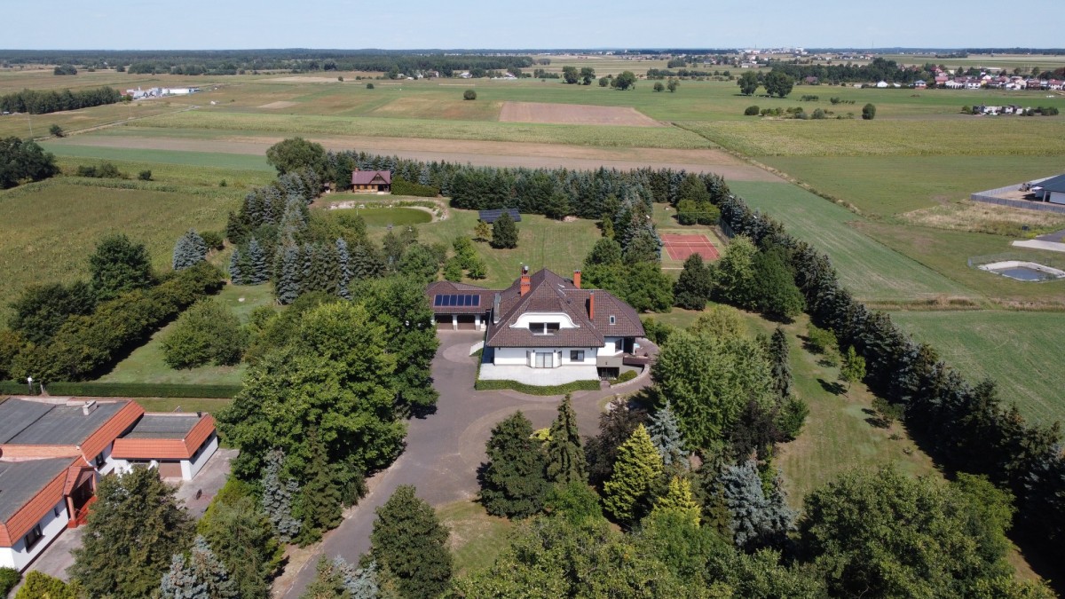Rozległa działka o powierzchni 1,9 hektara otacza tę wyjątkową rezydencję, zapewniając prywatność i przestrzeń. Na terenie działki znajduje się ogromny staw o wymiarach 30 m x 30 m, który nie tylko dodaje uroku, ale także jest wykorzystywany do podlewania trawnika. Rozległe tereny zielone otaczające rezydencje dodatkowo podkreślają unikalność tej nieruchomości.
