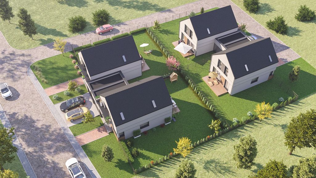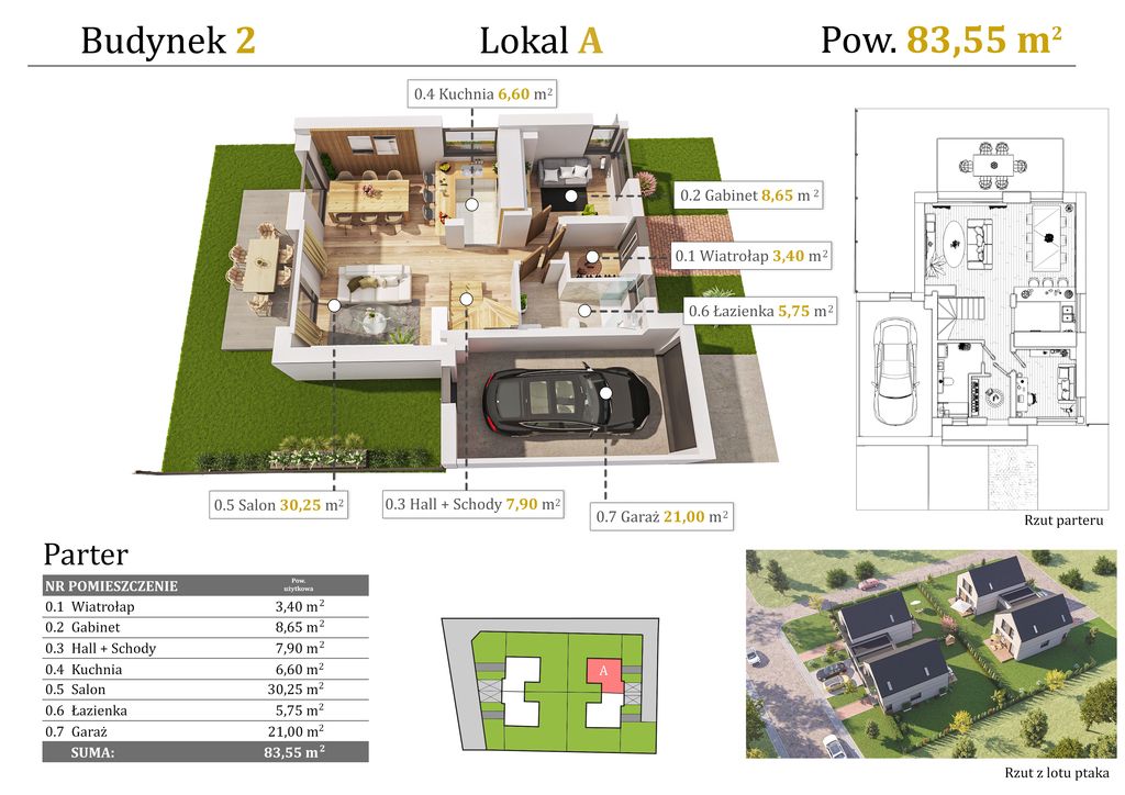 • Zabudowa: jednorodzinna dwulokalowa, garaż w bryle oraz dodatkowe miejsce postojowe naziemne,