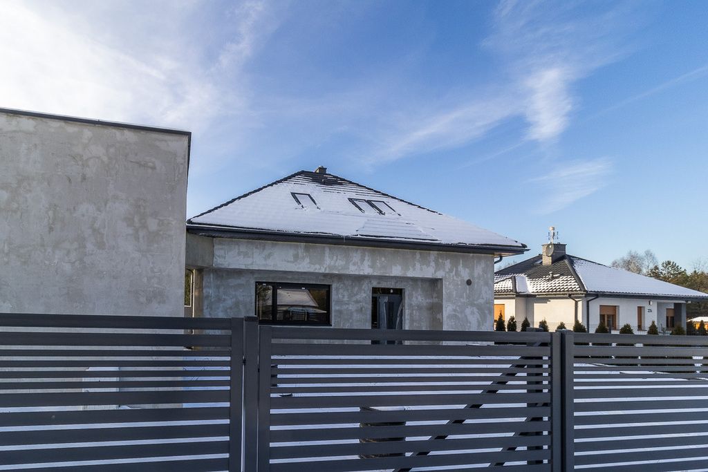 - Metalowe ogrodzenie, płaska działka z trawnikiem i drzewami piękne otoczenie domu