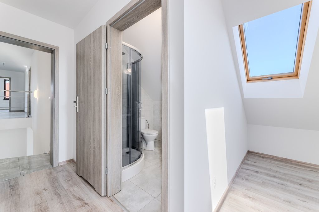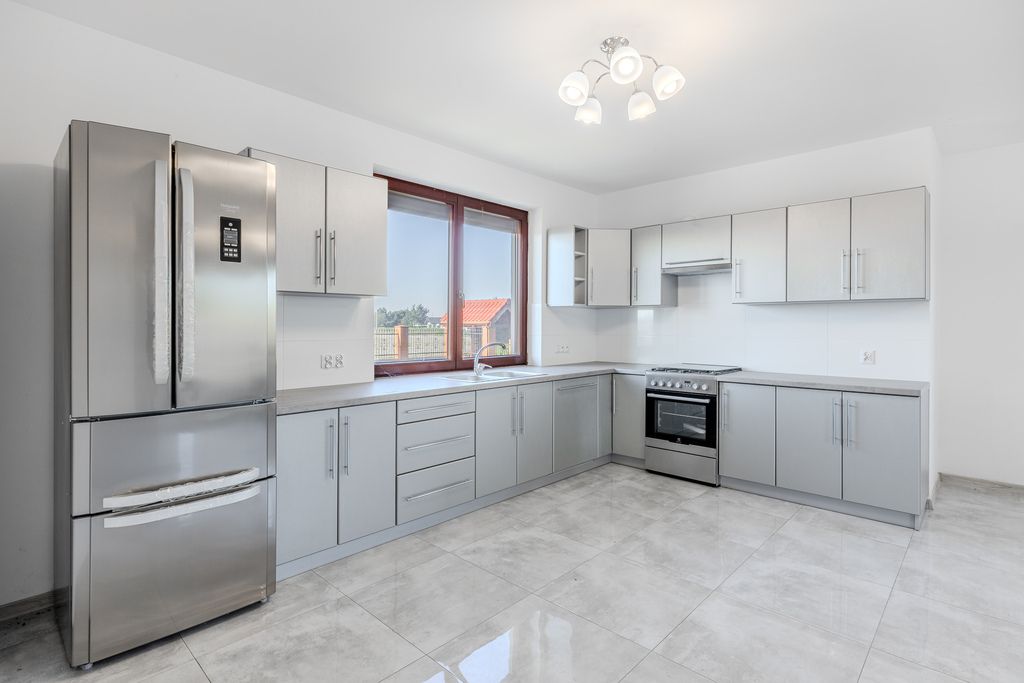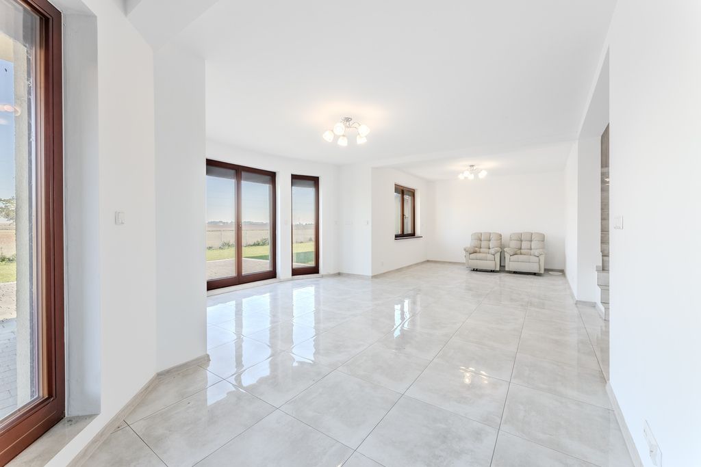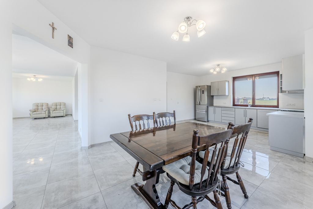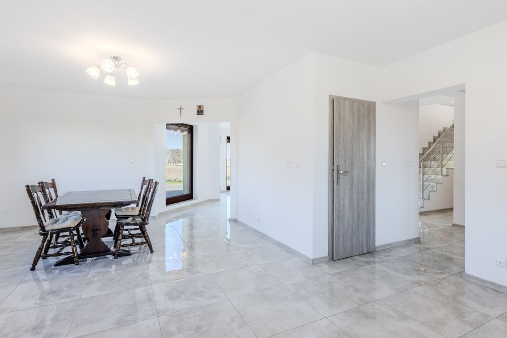 Nowoczesny dom jednorodzinny wybudowany w 2023 r., o powierzchni użytkowej 245 m², usytuowany na dużej, zagospodarowanej działce o pow. 3 000 m². Nieruchomość zlokalizowana na ul. Storczykowej 3 w miejscowości Jedwabno (gmina Lubicz). Stan prawny i techniczny: Dom oddany do użytku w 2023 roku, wysoki standard wykończenia. Dach pokryty wysokiej klasy dachówką ceramiczną, stolarka okienna drewniana trzyszybowa, drzwi wejściowe drewniane. Na działce znajduje się garaż dwustanowiskowy przylegający do budynku oraz dodatkowy budynek gospodarczy o powierzchni ok. 43,5 m². Nieruchomość częściowo umeblowana. Okna wyposażone w zewnętrzne rolety sterowane elektrycznie.