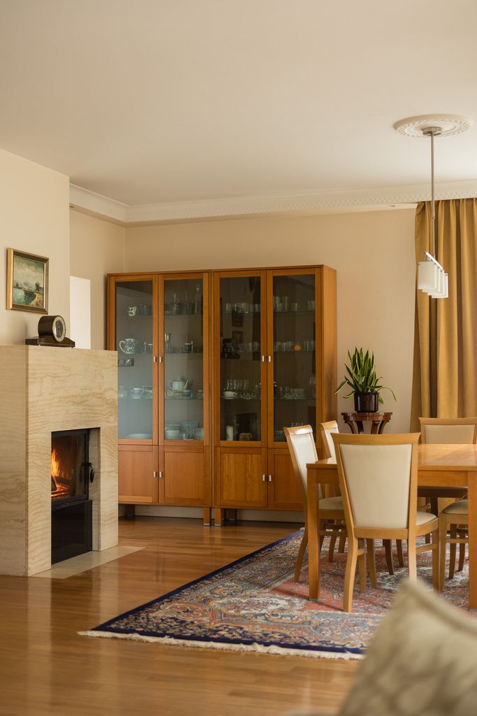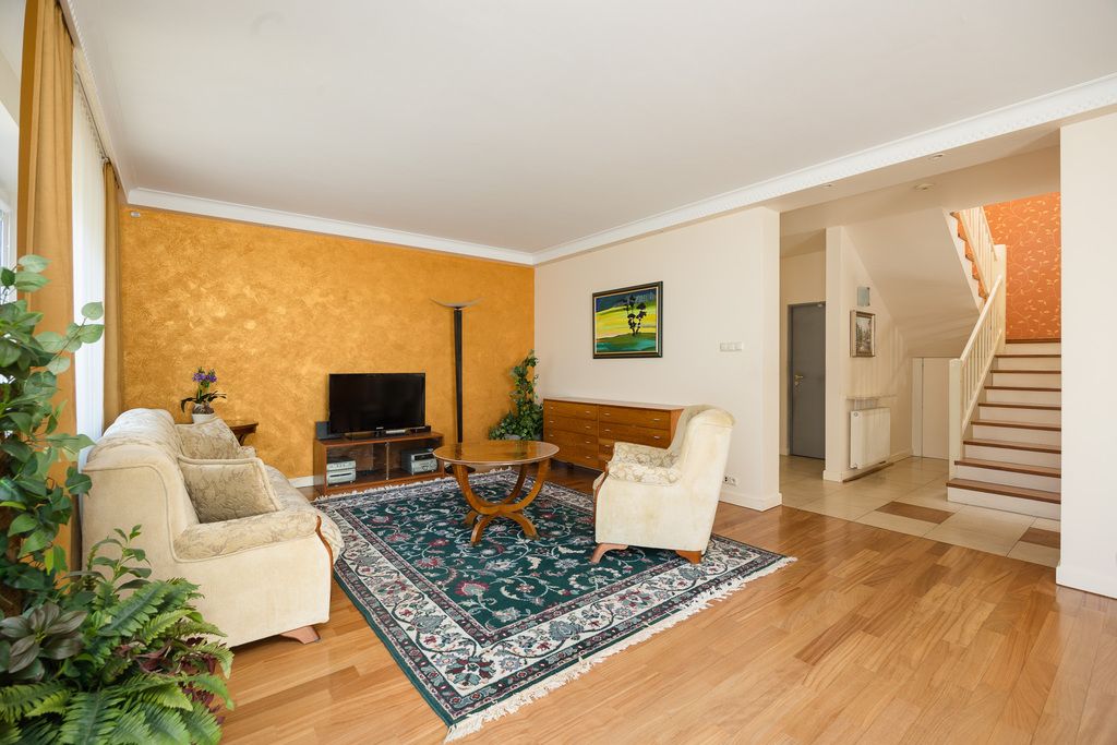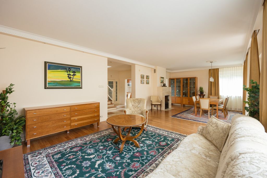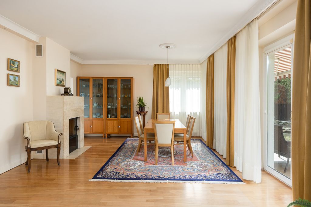 Na podłogach drewno egzotyczne (doussie) oraz gres, parapety i elementy wykończenia z trawertynu. Kominek z systemem dystrybucji ciepła realnie wpływa na komfort użytkowania. Instalacje zostały wymienione, drzwi są antywłamaniowe. Dom może zostać sprzedany z wyposażeniem.
