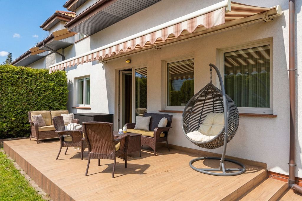 Na całej szerokości tarasu zamontowana została solidna, elektrycznie sterowana markiza, która w praktyce tworzy komfortową strefę wypoczynku i chroni przed słońcem. To przestrzeń, która przez letnią część roku działa jak naturalne przedłużenie salonu.