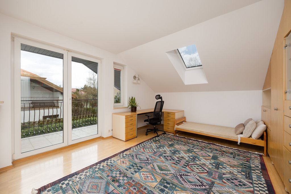 Piętro to trzy sypialnie, w tym jedna z prywatną łazienką (prysznic), a także druga, większa łazienka z wanną i możliwościami własnej aranżacji. Dwie sypialnie mają wyjścia na duży balkon skierowany w południowo wschodnią stronę.