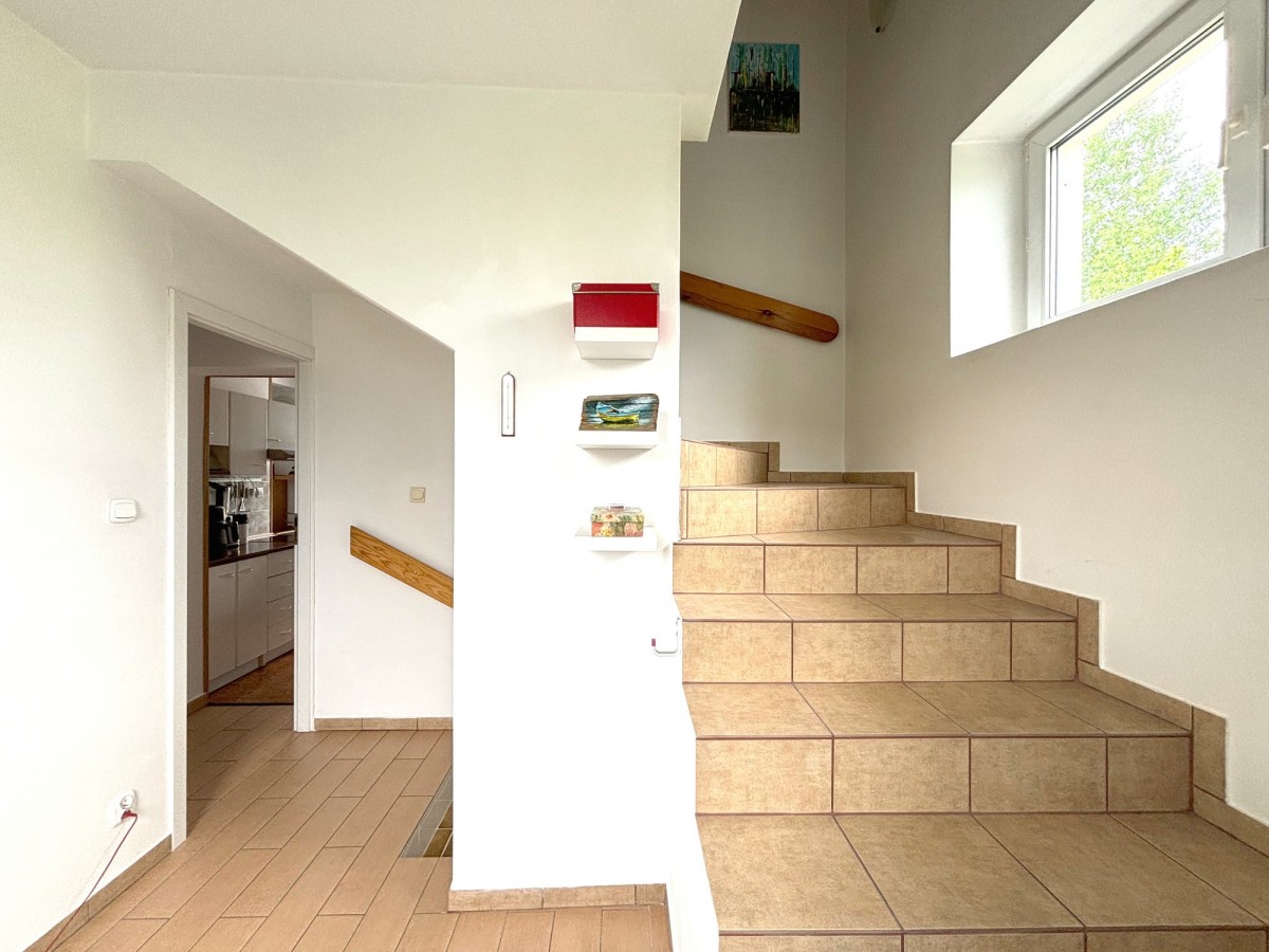 Klatka schodowa, hol na poziomie wejścia do domu wyłożone płytkami. W pralni również płytki.