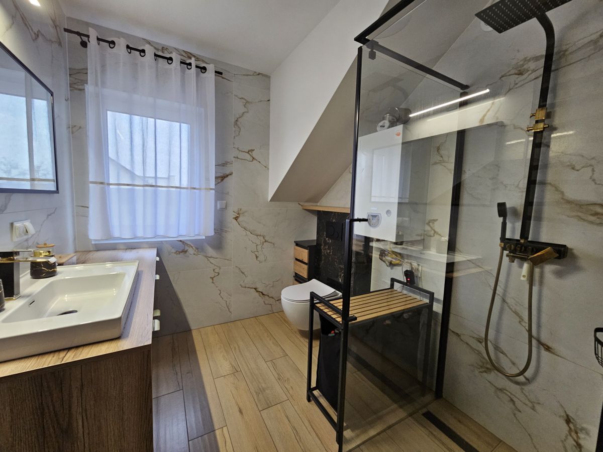 Dodatkowe udogodnienia, takie jak rolety w oknach sterowane elektrycznie, klimatyzacja która obejmuje cały dom podnoszą jakość życia w tym wyjątkowym miejscu.