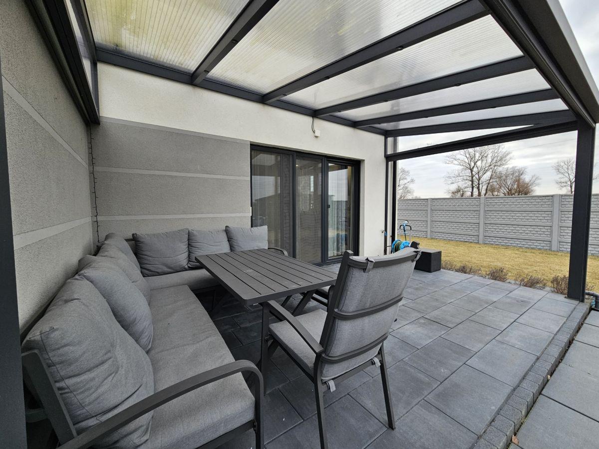 Taras wyłożony kostką , zadaszony i otoczony roletami. które chronią przed deszczem i słońcem (sterowane z pilota)