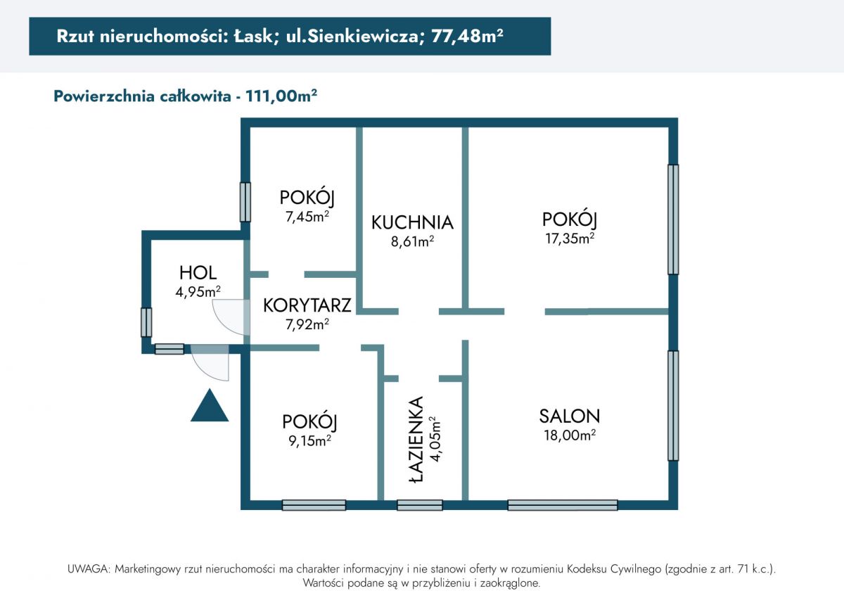Dom ma powierzchnię całkowitą 111 mkw, a użytkowej około 78 mkw, w jego skład wchodzą: