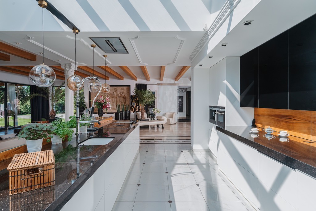 We wschodniej części znajduje się serce domu - duża, funkcjonalna kuchnia z przeszklonym sufitem oraz oddzielną spiżarnią.