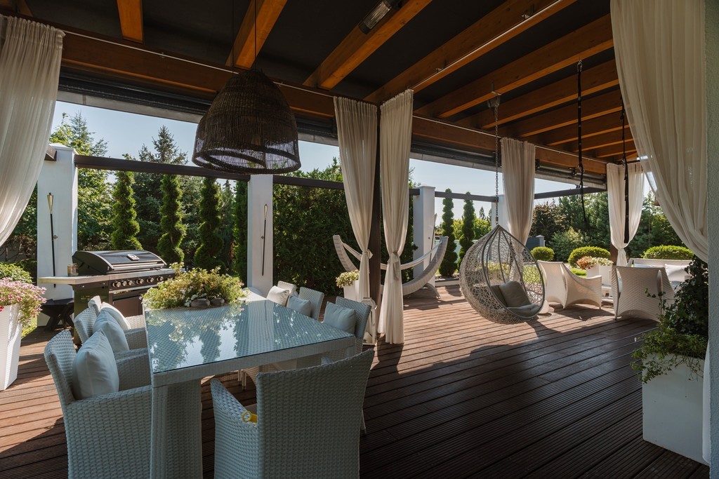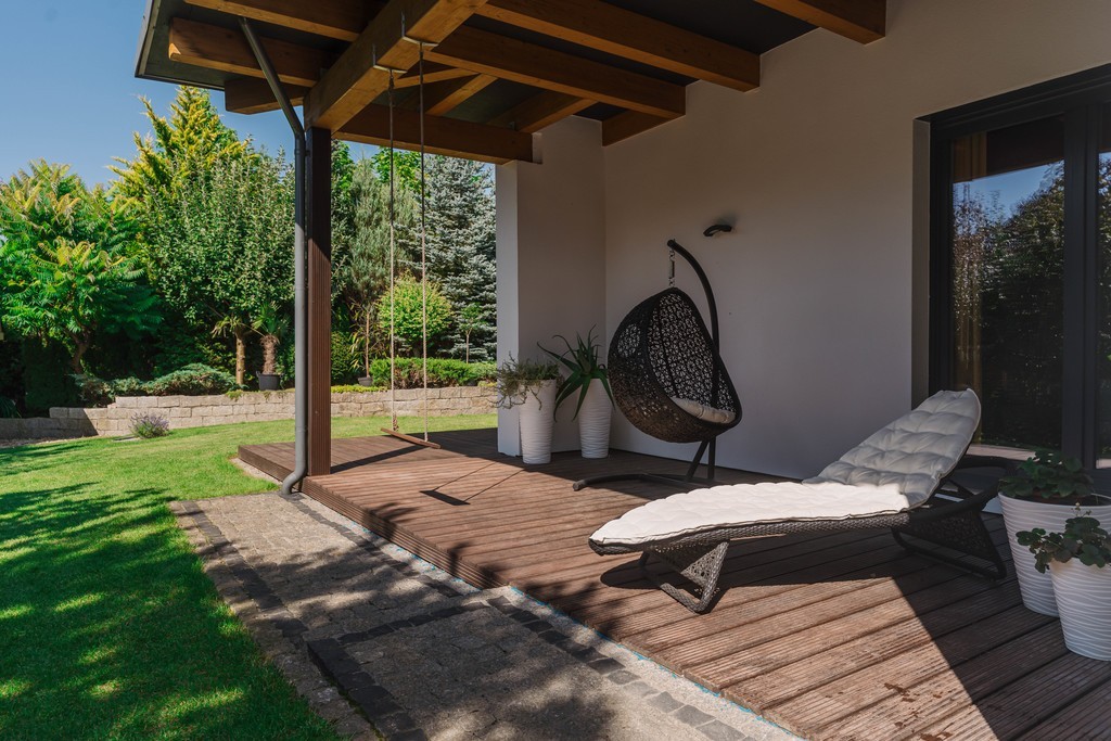Deski na zewnątrz są wykonane z materiału BANGKIRAI, który jest odporny na różne zjawiska atmosferyczne.