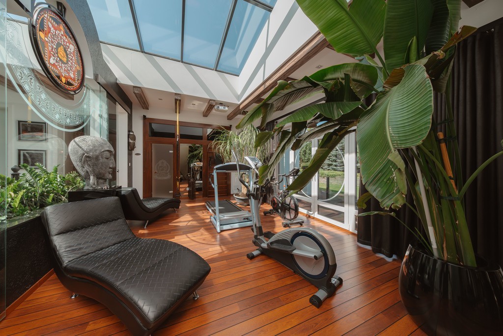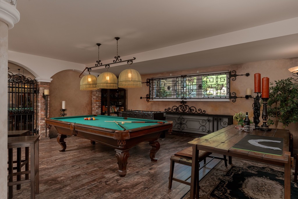 W północnej części domu, na wprost wejścia mieści się siłownia oraz sauna, a schodząc po schodach do podpiwniczenia w centralnej części hacjendy, odkryjesz strefę relaksu z bilardem oraz salą kinową!