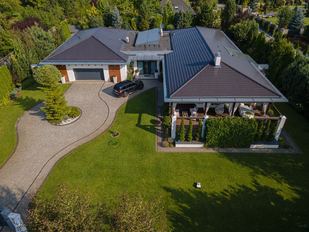 Posiadłość ogrodzona jest solidnym, murowanym płotem, a wjazd odbywa się przez automatyczną bramę.