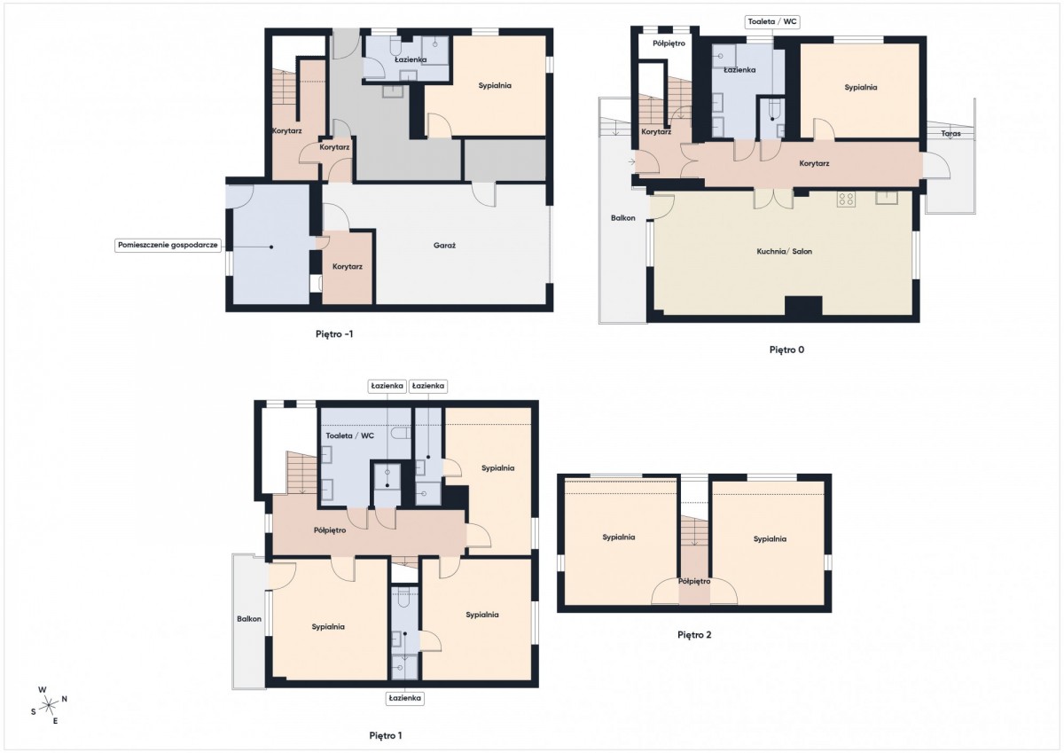 2) PIĘTRO: trzy sypialnie (w tym dwie z prywatnymi łazienkami), dodatkowa łazienka z prysznicem, osobna toaleta oraz korytarz z praktycznym aneksem kuchennym.