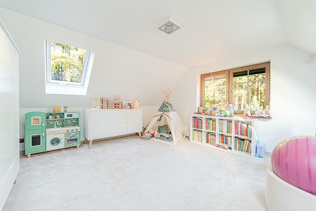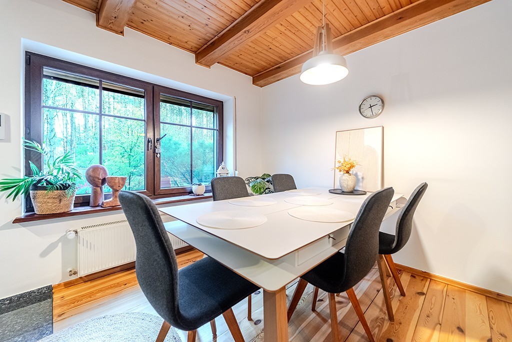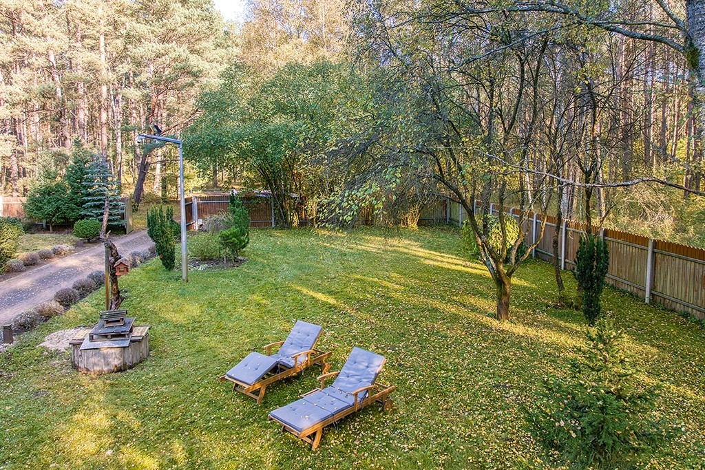 Teren w całości jest ogrodzony, by dzieci, psy, koty i marzenia nie uciekały do lasu. Dom zbudowany w 2006 roku w stylistyce: czuję las, kocham las, chcę żyć w lesie. Drewniane akcenty, naturalne barwy, klimat jak w domu z opowieści, ale bez skrzypiącej podłogi z 1890 roku. Tu wszystko jest solidne, zadbane i przemyślane.