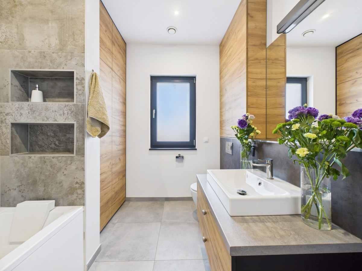 • Stolarka okienna: Aluminiowe i PCV, profile wielokomorowe, potrójnie szklone, współczynnik przenikania ciepła U=0,9 W/m²K, żaluzje zewnętrzne