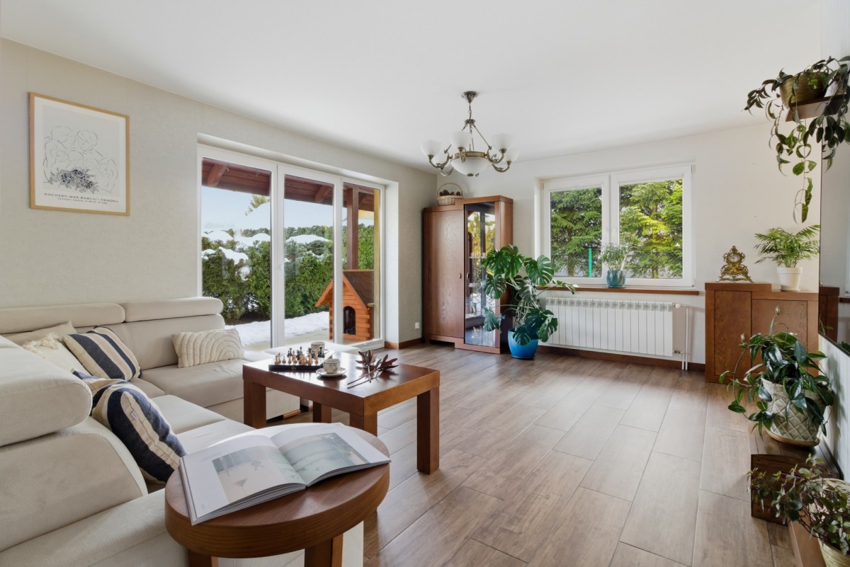 Salon z dużymi oknami, pełen naturalnego światła, z wyjściem na taras i ogród