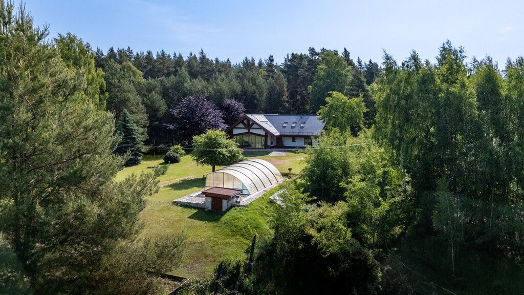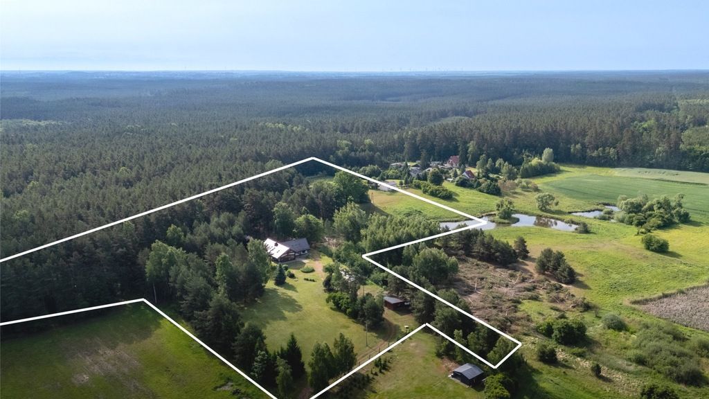 Budynek- Dom posadowiony na działce o powierzchni ponad 35 000 m2 tuż przy lesie z prywatnym stawem
