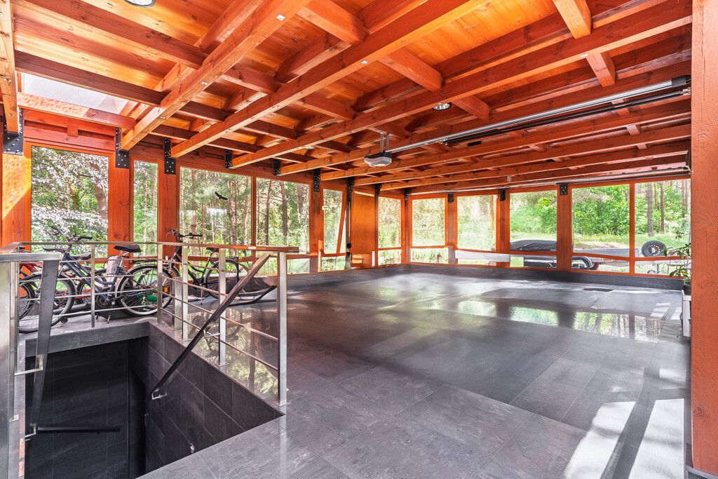 - Na parterze znajduje się przestronny salon z dużymi przeszkleniami na zieleń z funkcjonalną kuchnią, 2 pokoje, łazienka, spiżarnia garderoba, pomieszczenie techniczne, pokój telewizyjny oraz garaż. Piętro domu to część prywatna z 2 sypialniami i łazienką