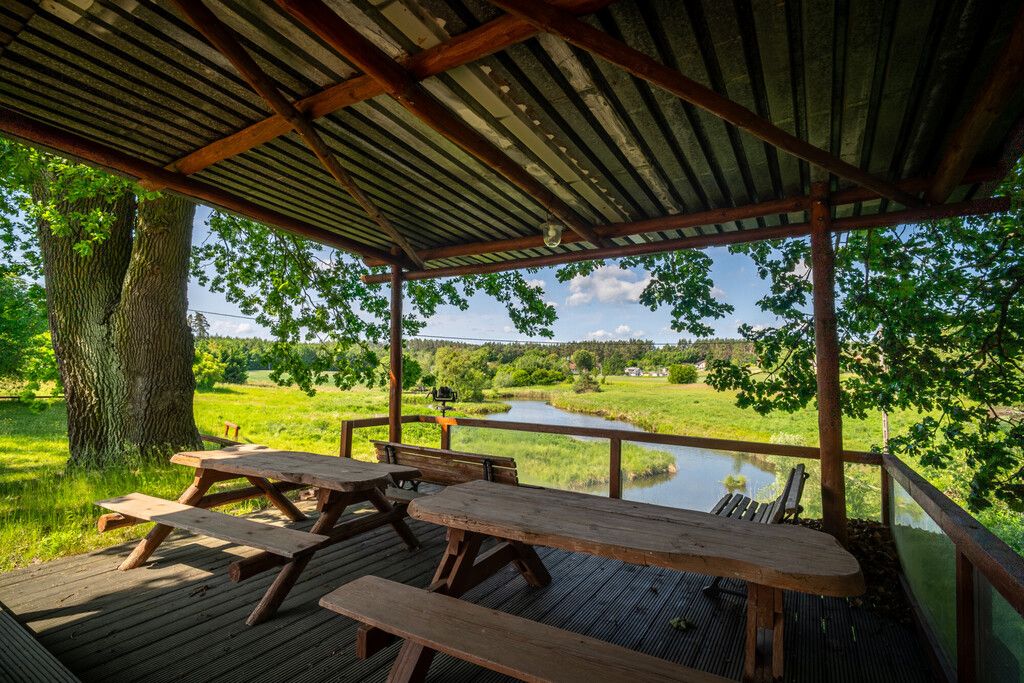 - Na działce znajduje się budynek gospodarczy o powierzchni 42 m2, basen letni, domek imprezowy oraz wiata widokowa na staw i pola