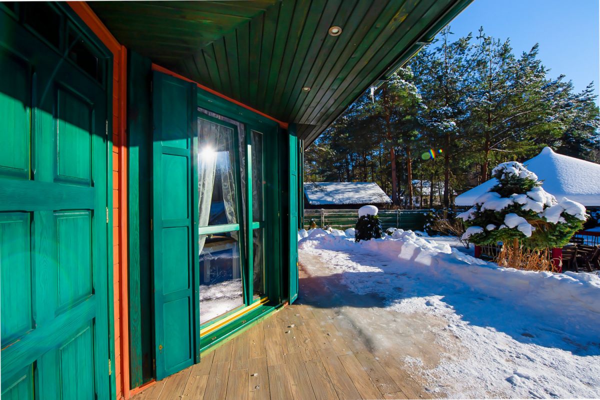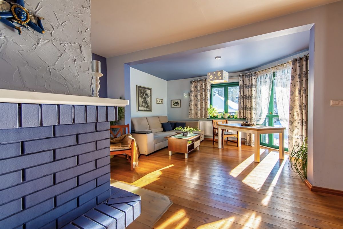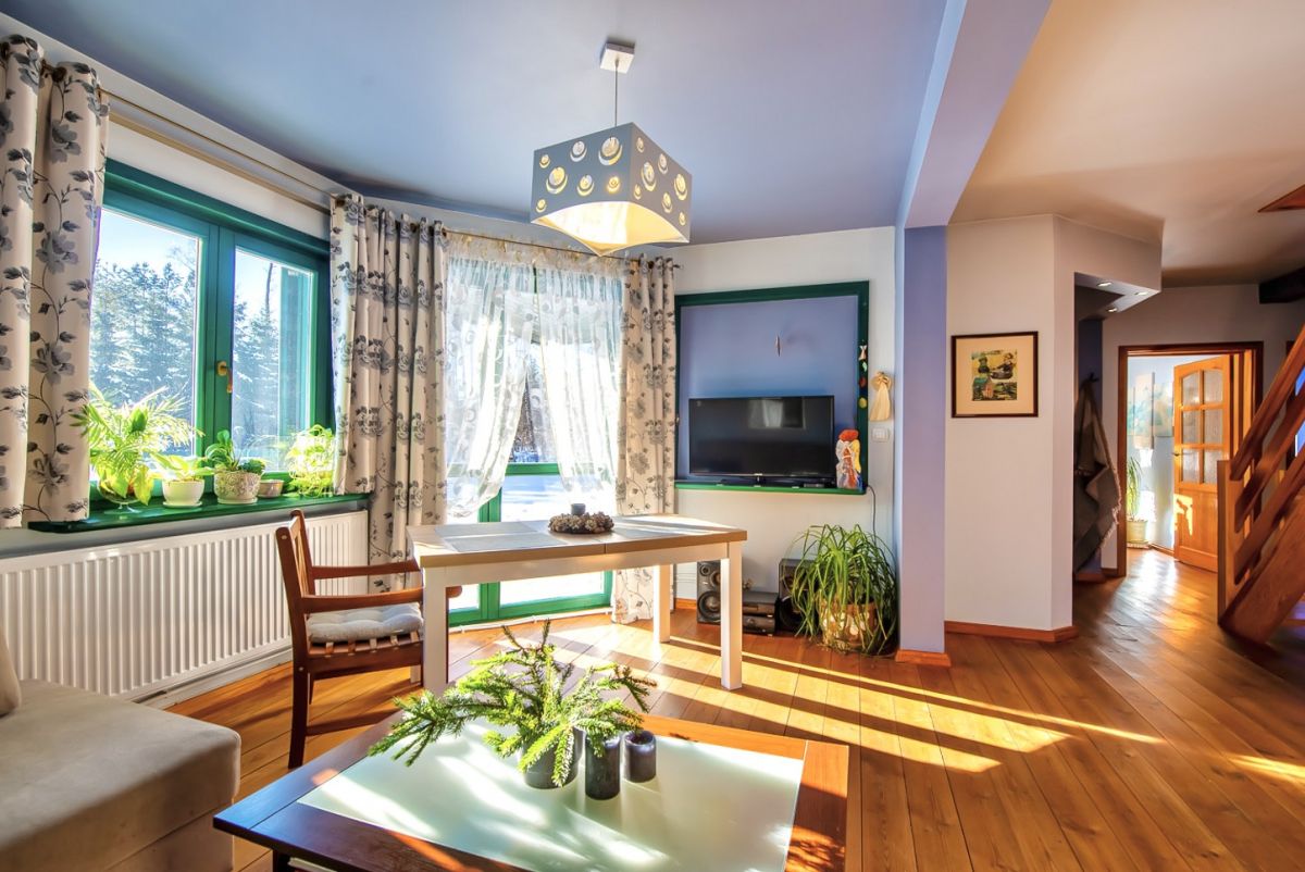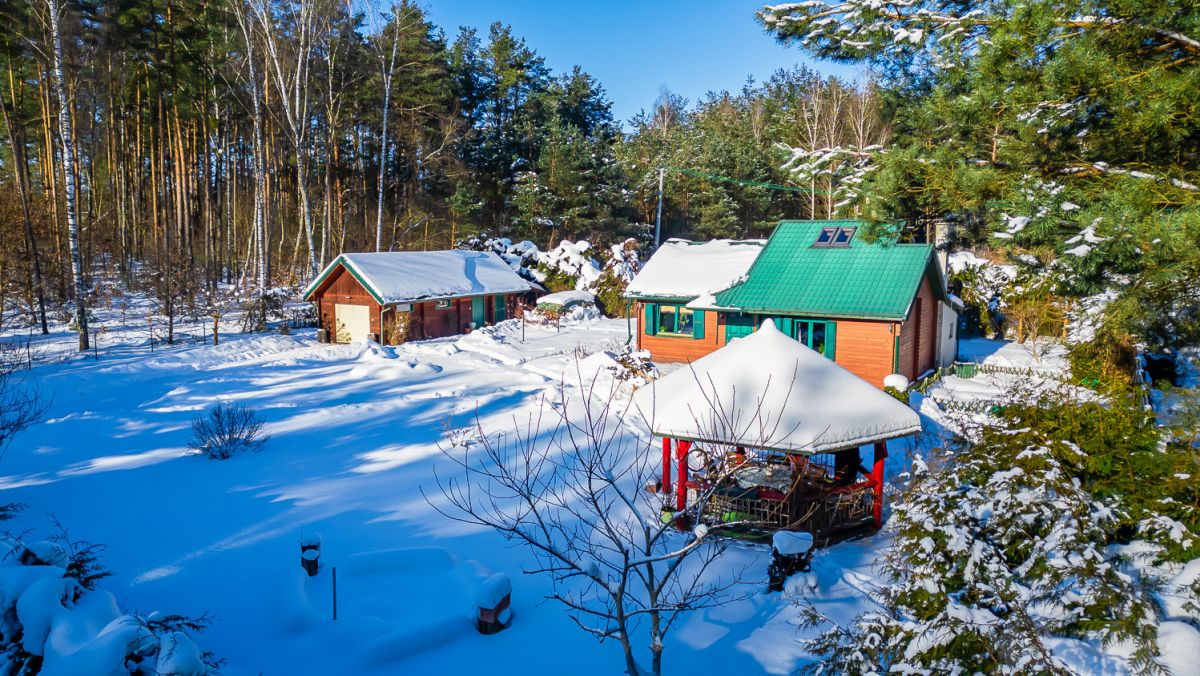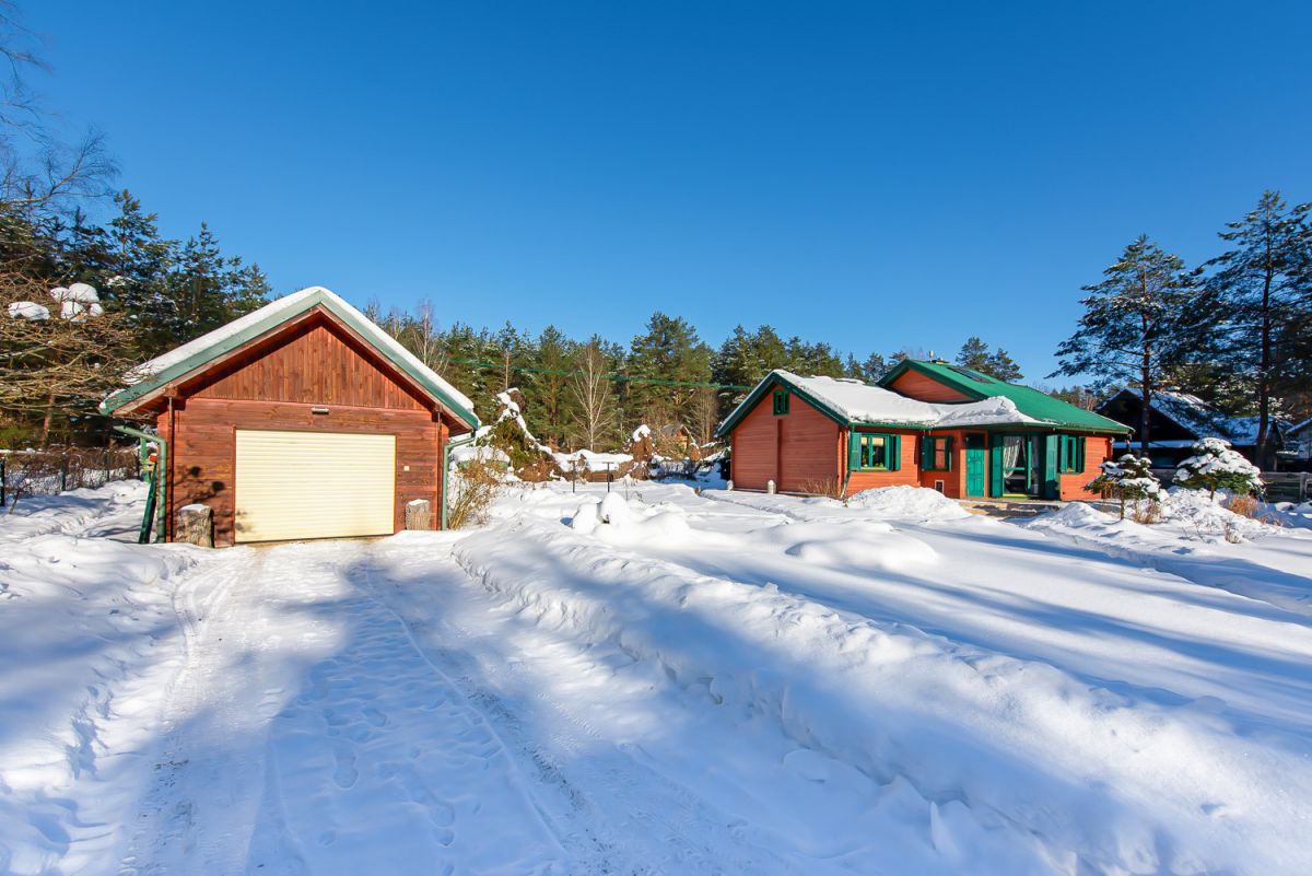 To charakterystyczny, całoroczny dom drewniany z zielonymi okiennicami, usytuowany na pięknie zagospodarowanej działce, w otoczeniu drzew, w niezwykle spokojnej i kameralnej okolicy.