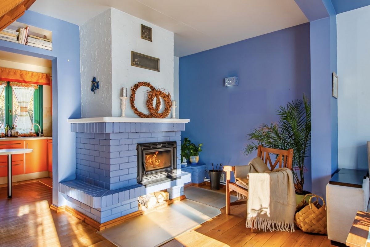 • salon z kominkiem i dużym oknem tarasowym