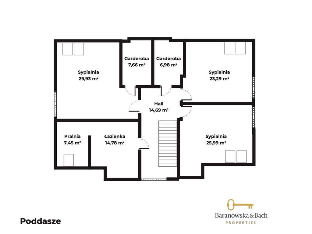 Poddasze (131 m²): Cztery sypialnie (w tym największa ma blisko 30 m²), dwie łazienki, garderoba oraz hall.