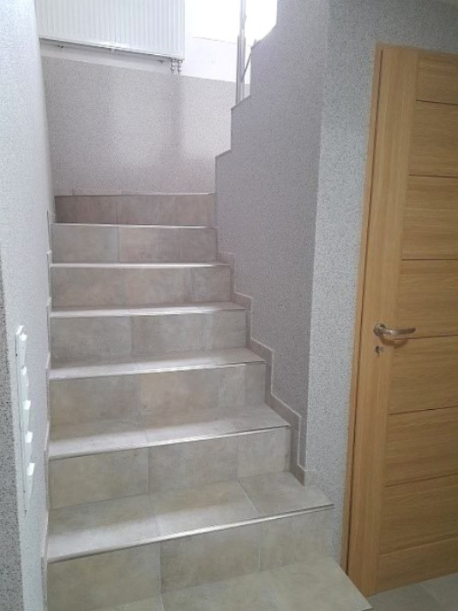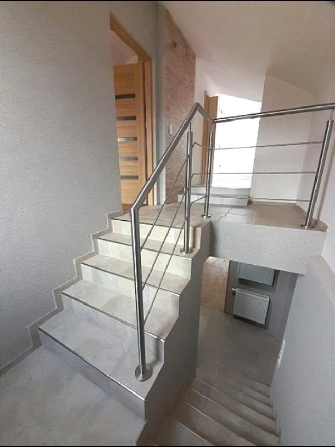 Na piętro prowadzą schody wykończone balustradą ze stali nierdzewnej .