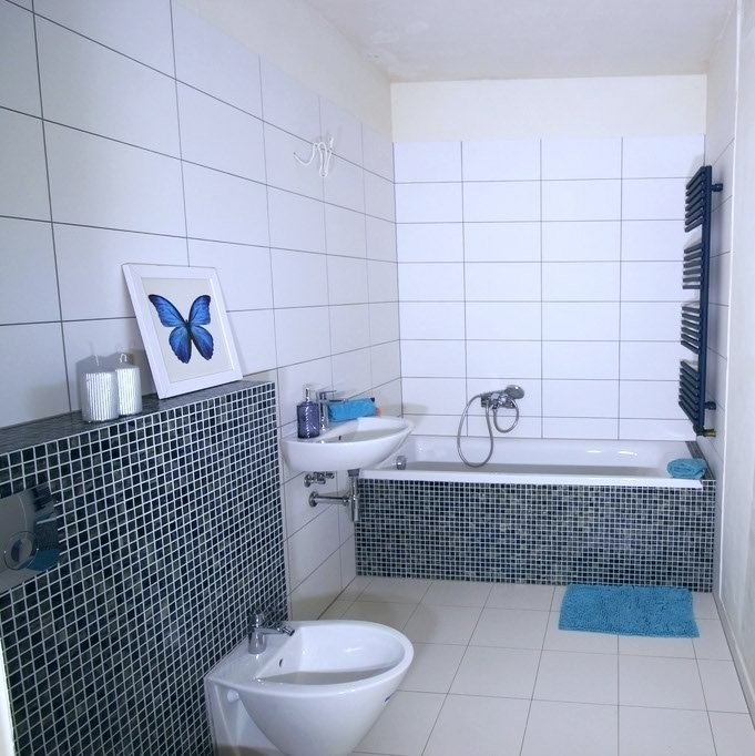 Na podłogach zastosowano płytki gresowe dobrej jakości, panele, na ścianach mozaikę. Armatura Geberit, Roca.