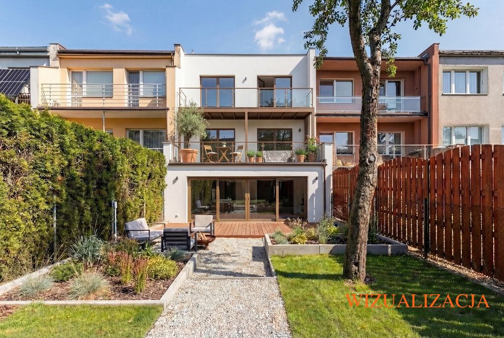 Dom szeregowy posadowiony jest na działce o powierzchni 275 m², z ogrodem znajdującym się w tylnej części posesji. Powierzchnia użytkowa budynku wynosi 212,9 m², co daje bardzo komfortowe warunki do życia nawet dla większej rodziny.