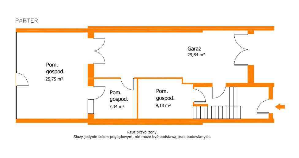 Na parterze znajduje się garaż na całą długość budynku oraz dodatkowe pomieszczenie, które może zostać przeznaczone na gabinet, biuro lub zaplecze gospodarcze. Przestrzeń też daje możliwość aranżacji biurowej lub nieuciążliwej usługowej.