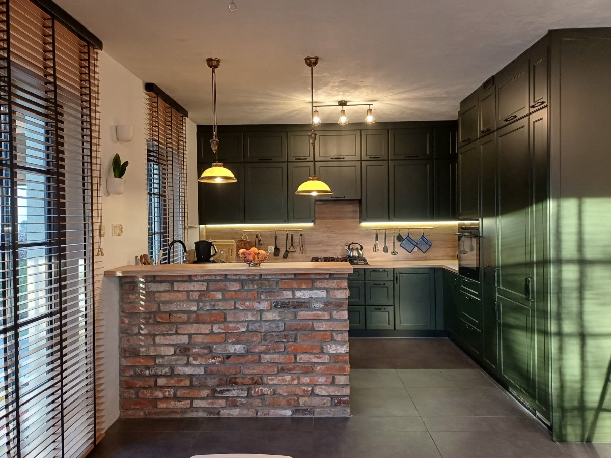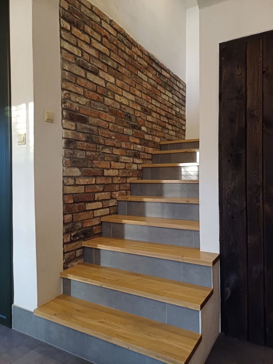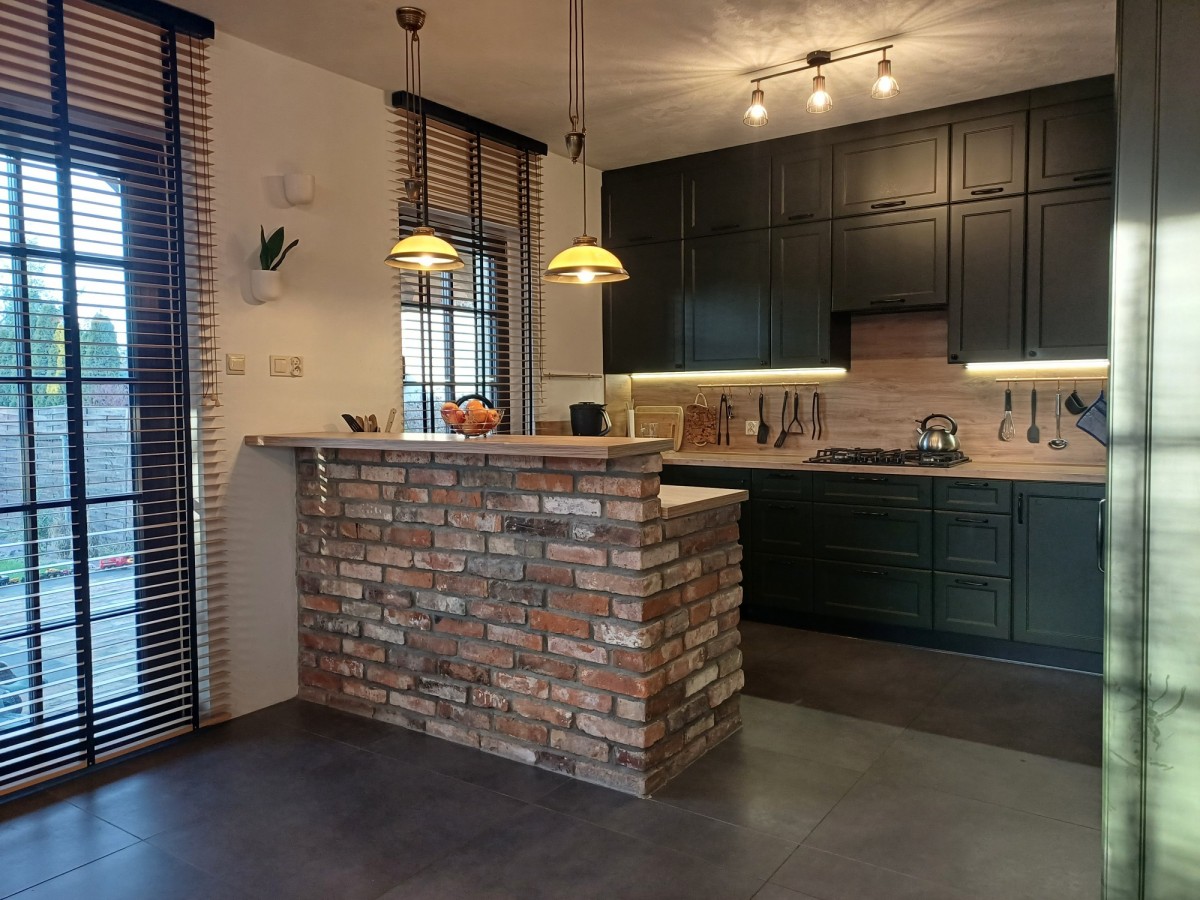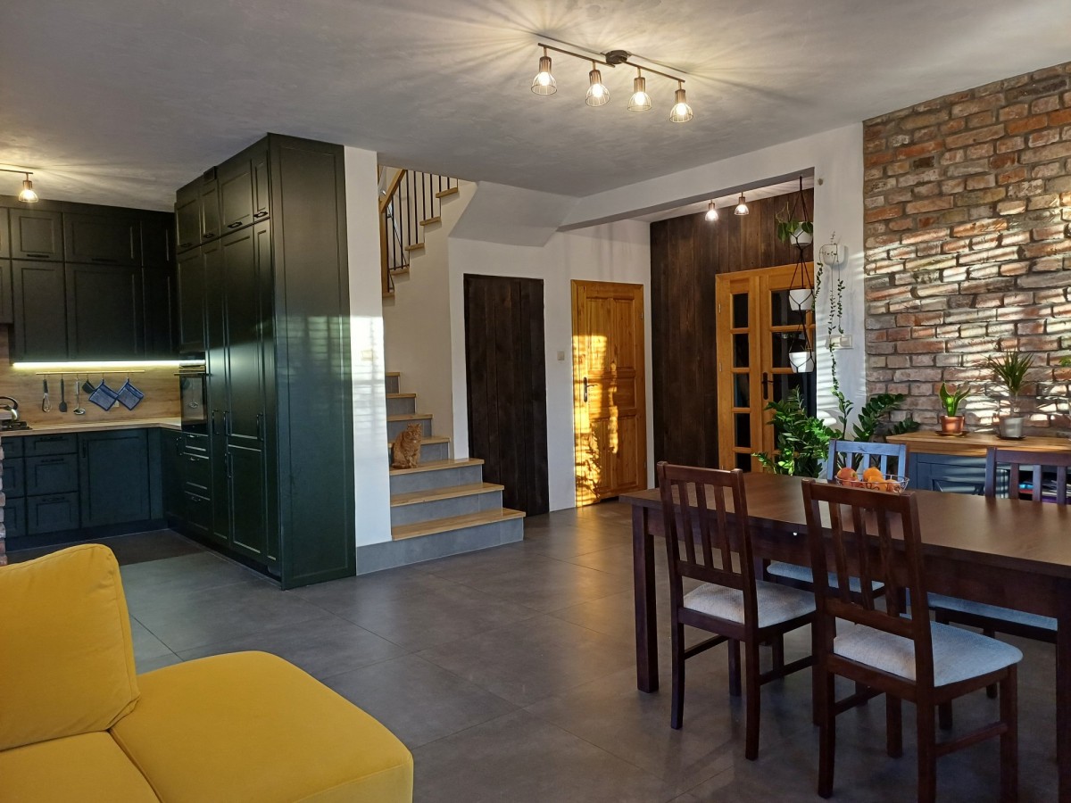 Kuchnia zabudowana na wymiar wraz ze sprzętami AGD. Na podłogach w pokojach gres oraz panele. Na ścianach ozdobna cegła oraz oryginalne, wypalane deski. Schody dębowe, drwi wewnętrzne sosnowe.