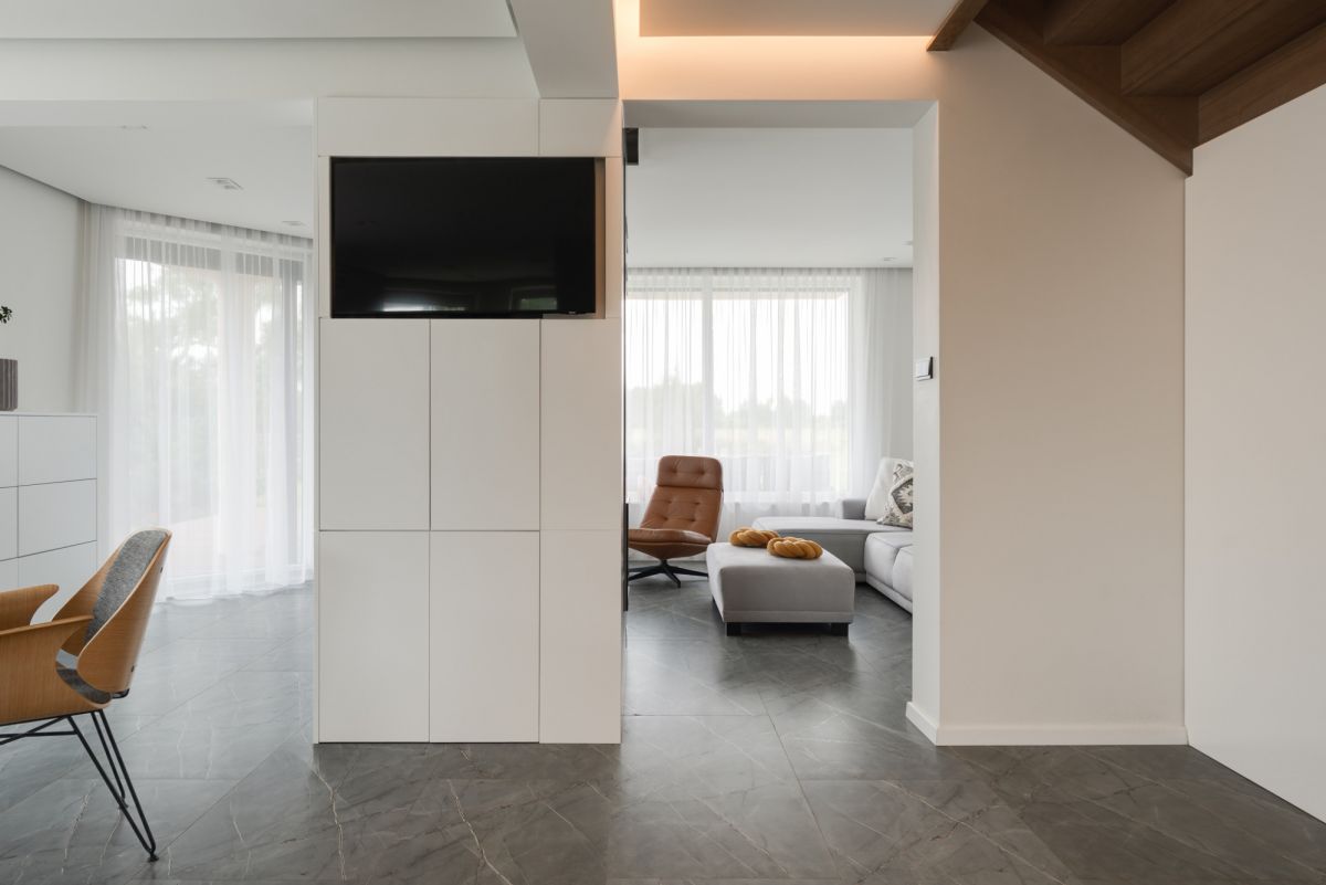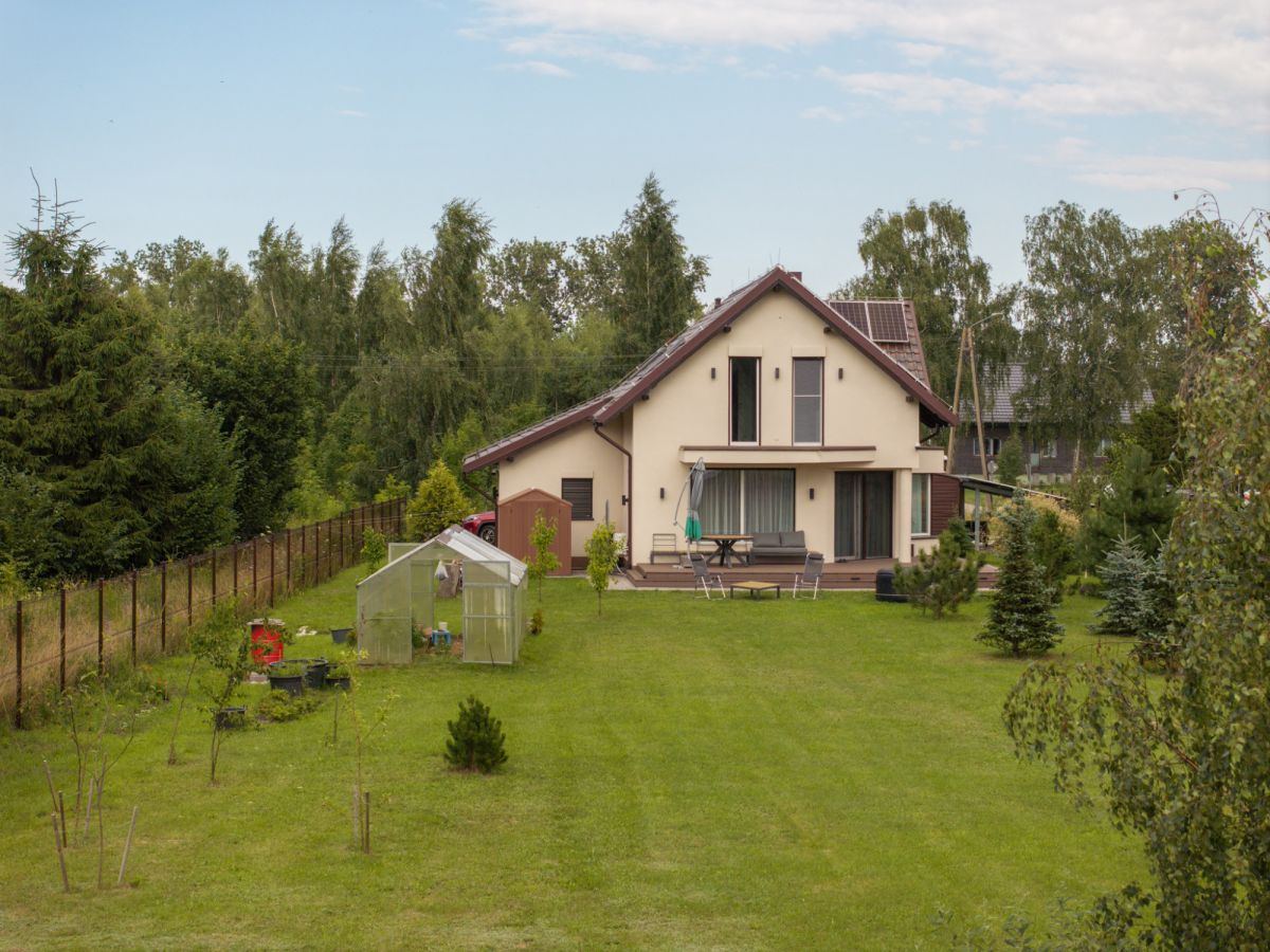 Dom jest w pełni wyposażony w zaawansowane rozwiązania technologiczne: 15 kW instalację fotowoltaiczną, gruntową pompę ciepła, rekuperację w każdym pomieszczeniu, system smart home Google oraz przydomową oczyszczalnię ścieków co czyni go samowystarczalnym. Dzięki roletom antywłamaniowym i zdalnemu sterowaniu funkcjami budynku, mieszkańcy mogą czuć się bezpiecznie i komfortowo.