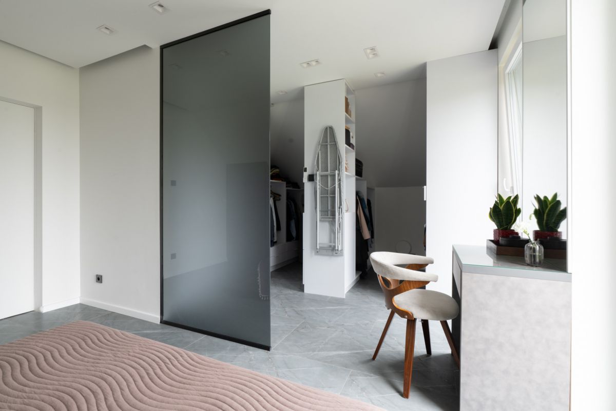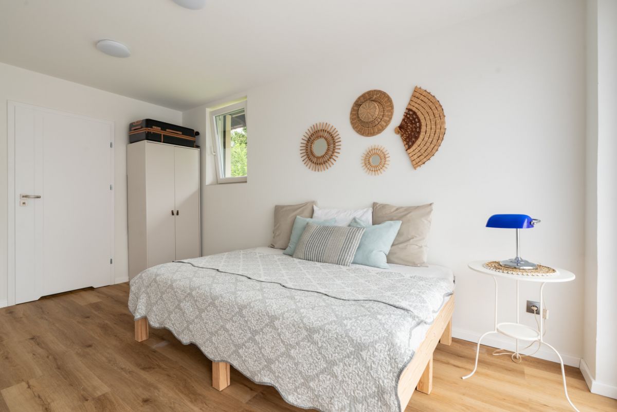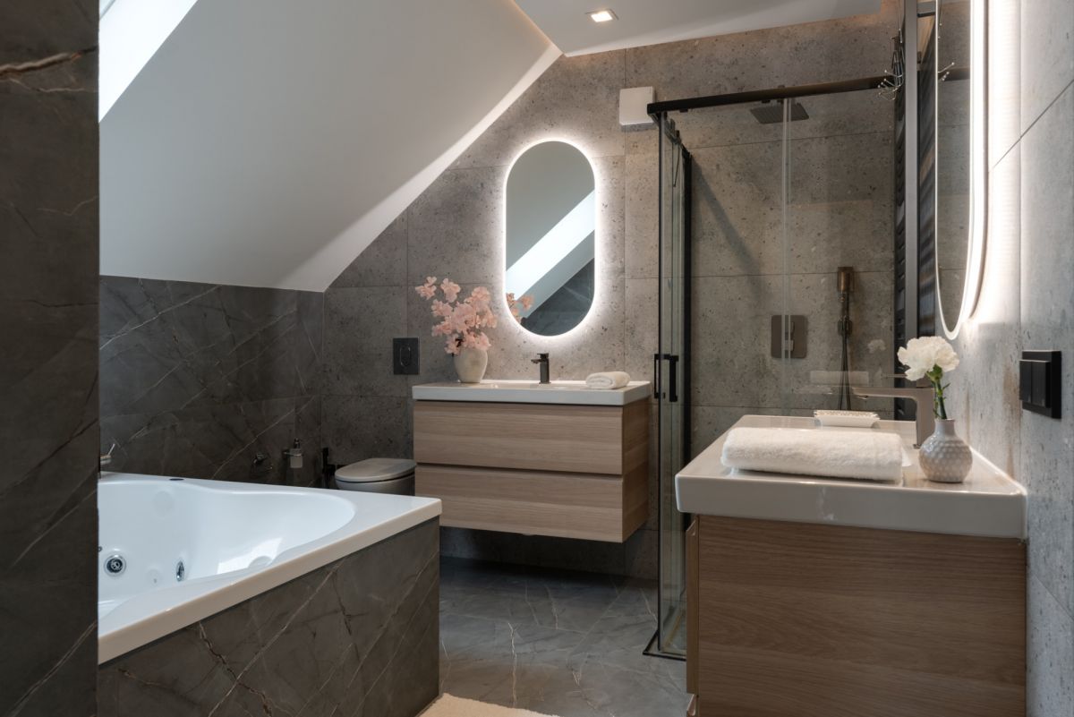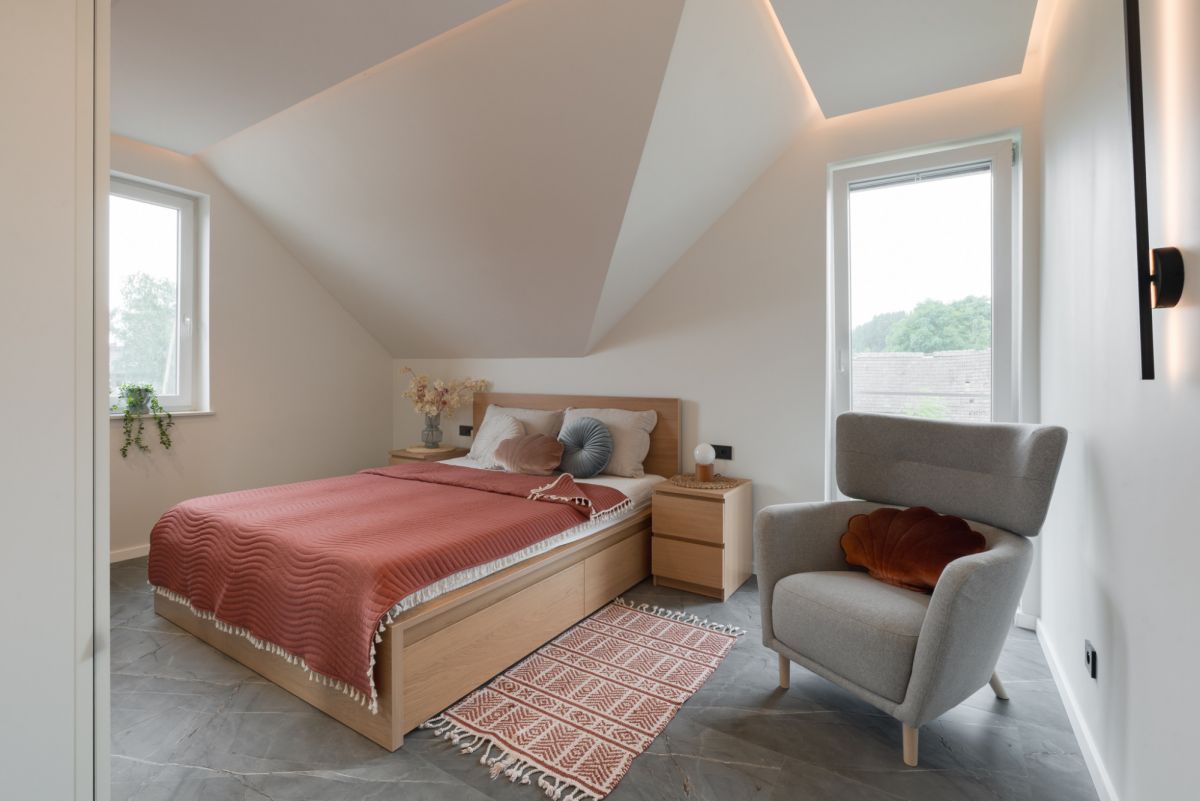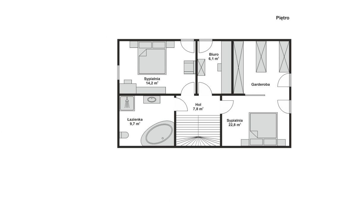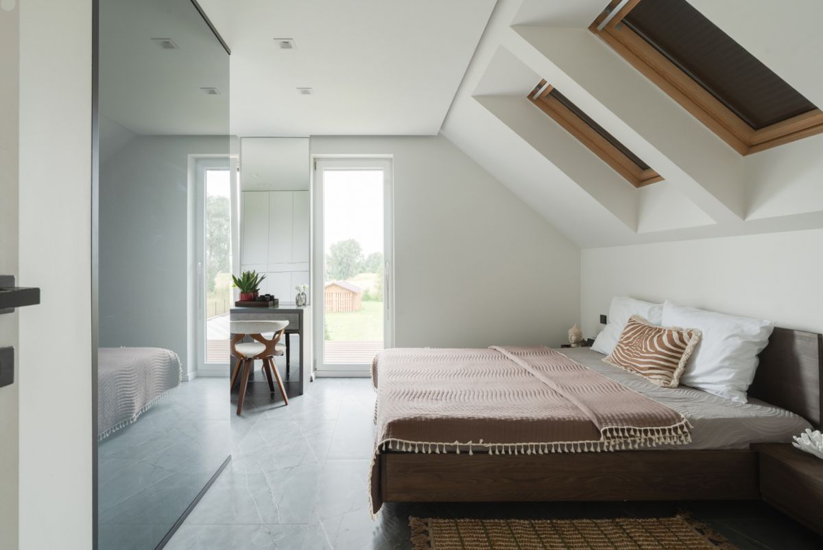 Na piętrze dom oferuje dwie komfortowe sypialnie, w tym jedną z prywatną garderobą, funkcjonalny gabinet do pracy zdalnej oraz drugą łazienkę z wanną z hydromasażem i prysznicem.