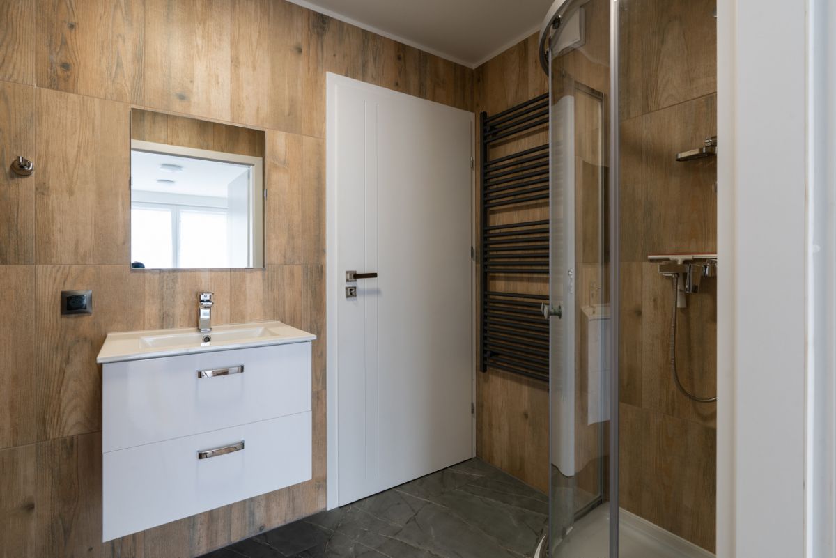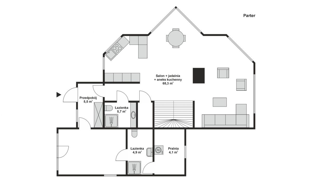 Na parterze znajduje się przestronny salon z kominkiem i ekranem z rzutnikiem, połączony z nowoczesną, w pełni wyposażoną kuchnią oraz jadalnią. Tuż obok mieści się łazienka z prysznicem oraz elegancki wiatrołap z zabudową.