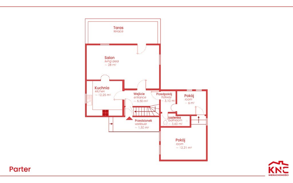 Na parterze znajduje się przestronny salon, wykończony stylowym parkietem w jodełkę oraz ozdobnymi belkami stropowymi, co tworzy ciepły i przytulny klimat. Salon połączony jest z jadalnią, która doskonale sprawdzi się jako miejsce spotkań z rodziną i przyjaciółmi. Bezpośrednio z salonu można wyjść na duży taras, zachęcający do relaksu na świeżym powietrzu. Na tym poziomie znajduje się również w pełni wyposażona kuchnia, dwa dodatkowe pokoje, które mogą pełnić funkcję gabinetu, pokoju gościnnego lub bawialni, oraz łazienka z prysznicem.