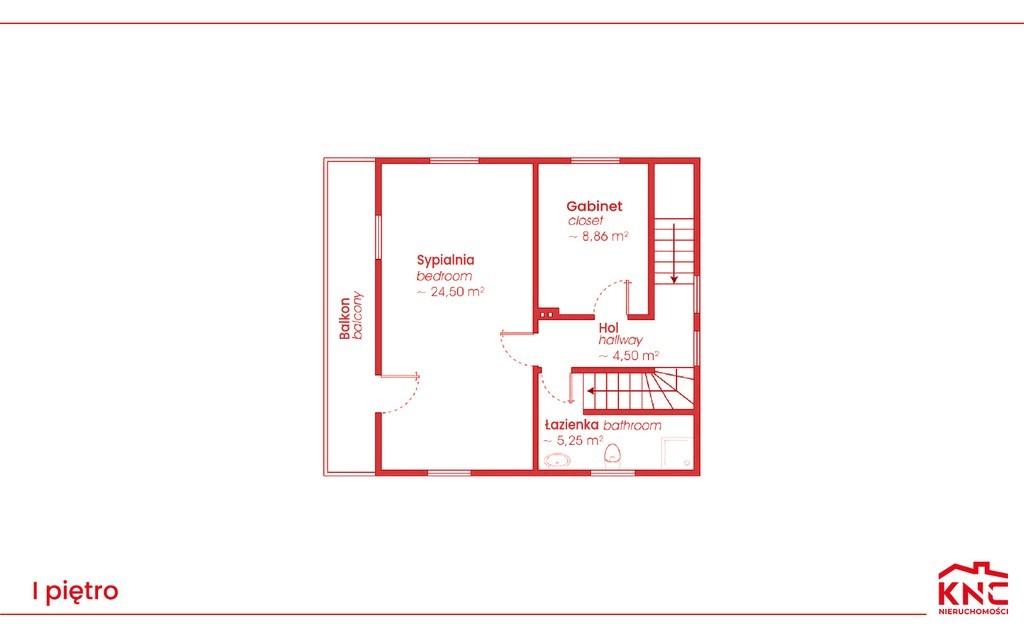 Na piętrze znajduje się główna sypialnia z dostępem do balkonu, oferującego widok na piękną okolicę. Dwa dodatkowe pokoje można dostosować do indywidualnych potrzeb mieszkańców, a funkcjonalność tego piętra dopełnia druga łazienka z prysznicem.